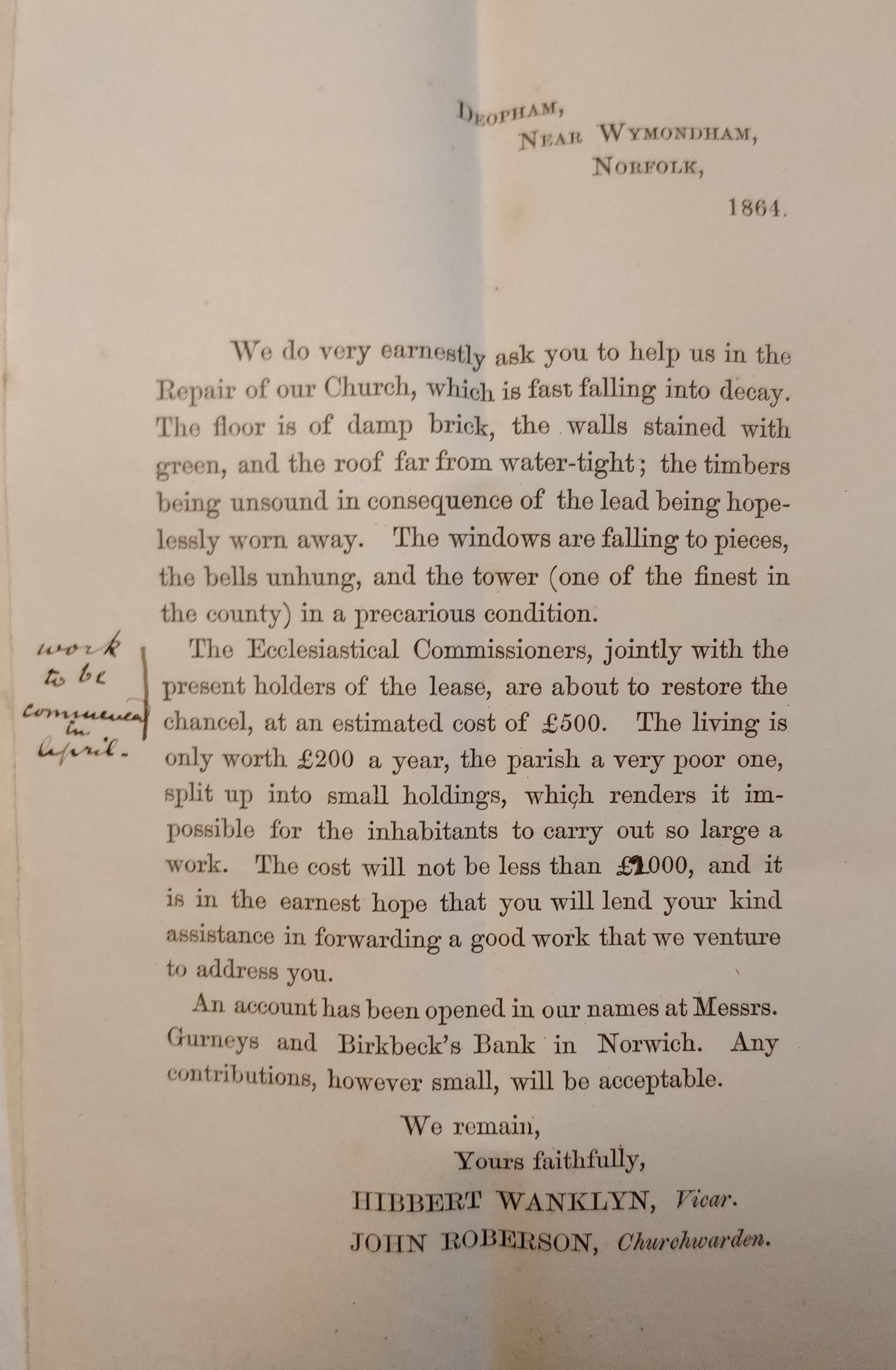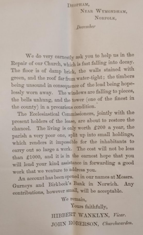 In 1878 there was still an outstanding debt for these works; the following letter from Robert Phoenix was addressed to the Ecclesiastical Commissioners. It is unusual for these Deopham projects that it was the churchwarden rather than the vicar appealing for funds.
