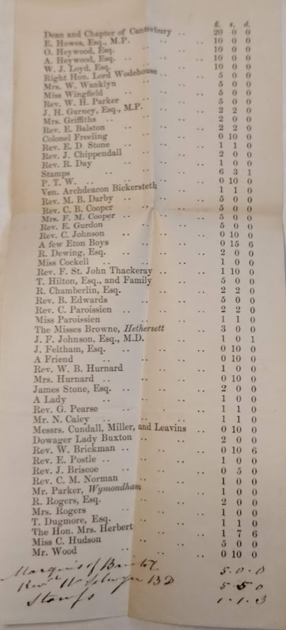 “A few Eton boys” forwarded 15s 6d to the restoration fund: these could well have been former pupils from the time when Rev. Hibbert Wanklyn was resident at Eton College – see here.