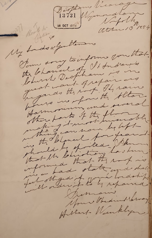 I am sorry to inform you that the Chancel of St Andrew’s Church Deopham is in great want of repair as regards the roof. The rain pours in upon the Altar, Harmonium and several other parts of the floor making it most miserable – nothing can now be left in the Chancel for fear it should be spoiled. I know that Mr Christian1 has been informed that the roof is in a bad state, and shall feel obliged if your Lordships will order it to be repaired.