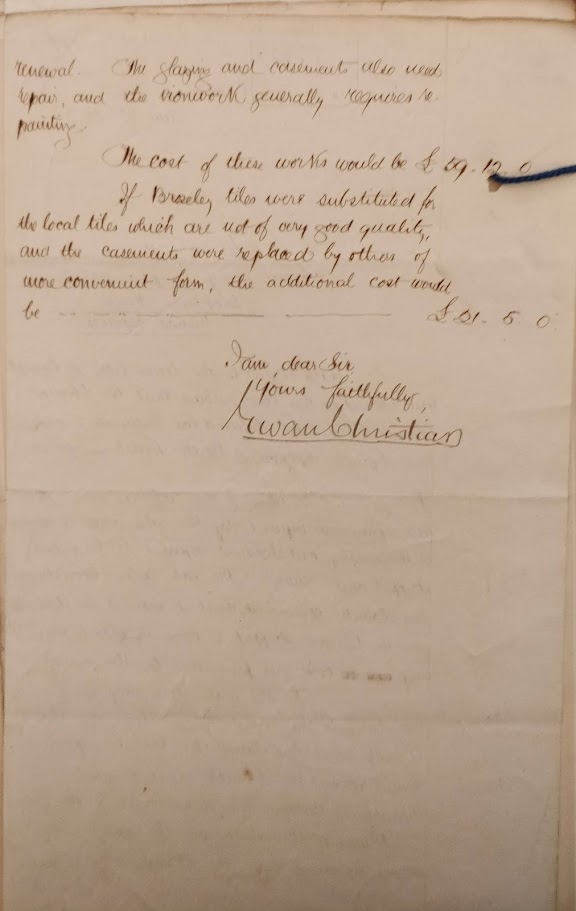 - the local tiles used were “not of very good quality” and should be replaced with factory made Broseley tiles from Shropshire at an additional cost of £21 5s 0d.