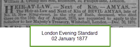 Heirs of Bevil Amyas were sought, although the following advertisement seems to be the extent of the newspaper quest.