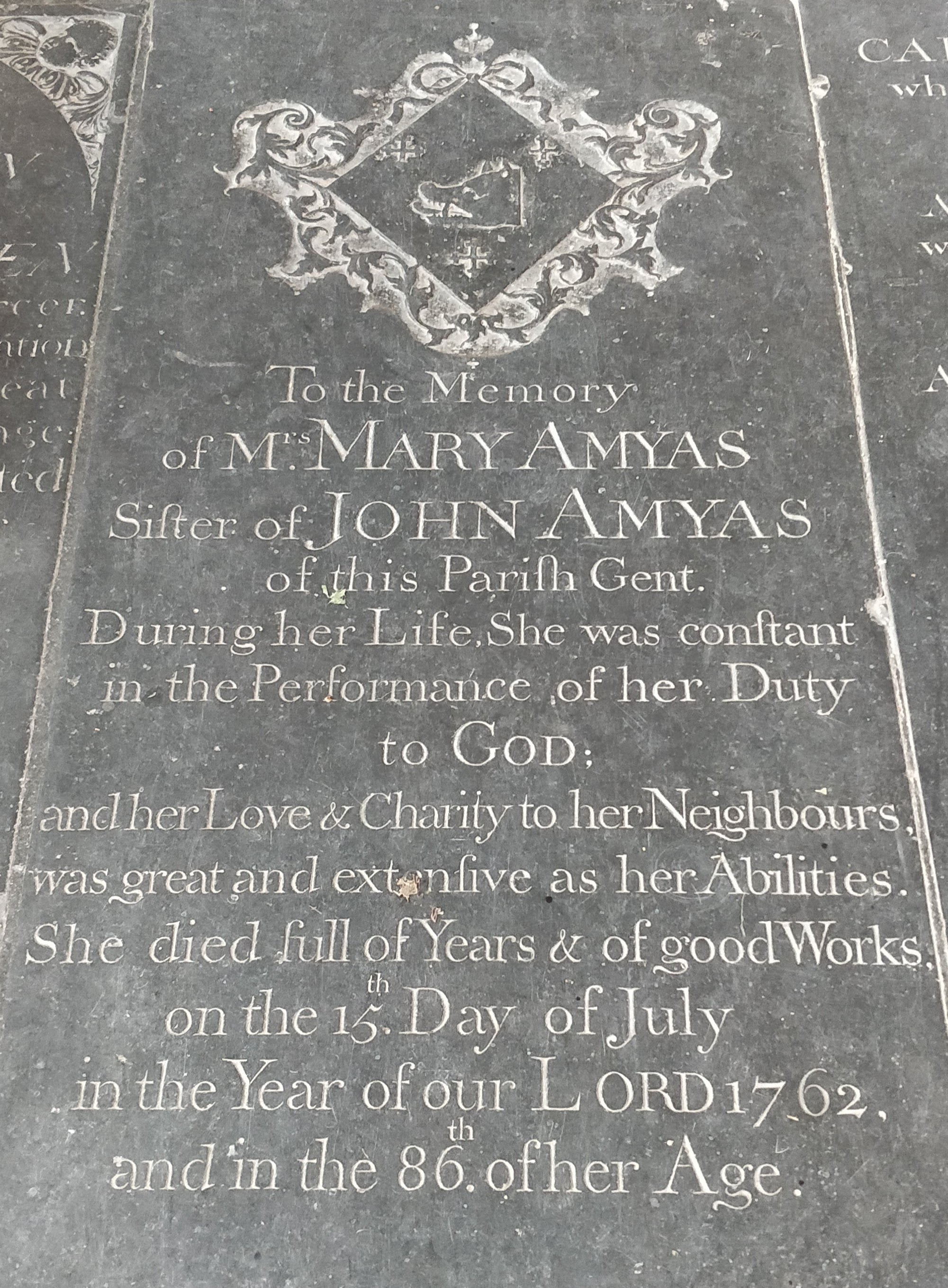 John and Mary Amyas, brother and sister, lived and died in Hingham. John Amyas was the owner of Hall Farm (now known as Crown Farm) in Deopham, as well as the leaseholder of Church Farm (leased from the Dean and Chapter of Canterbury1).
