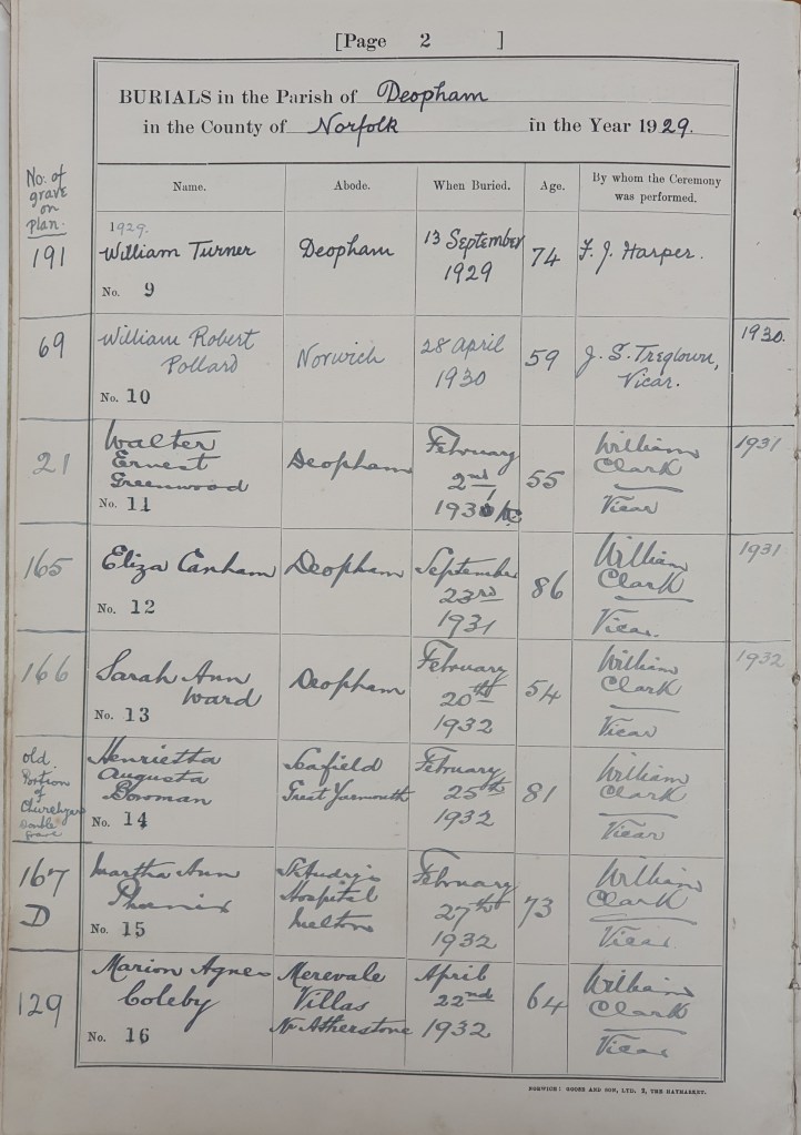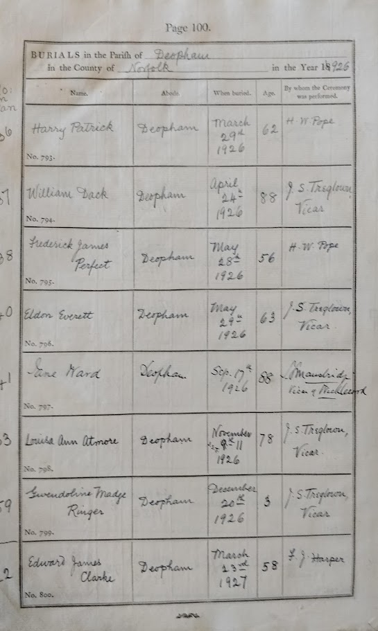 The burials for this period are spread over two pages in different parts of the Deopham register; some burials are intermingled with births and marriages, some on a page dedicated to burials.
