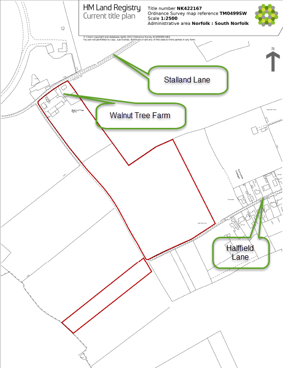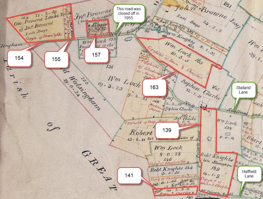 Note: Stalland Lane has been straightened since the time of the enfranchisement in 1907 leaving the road separated from the land over which the Church Commissioners have their rights. There is an image showing the 1906 road layout overlaid on a 2025 satellite view here.