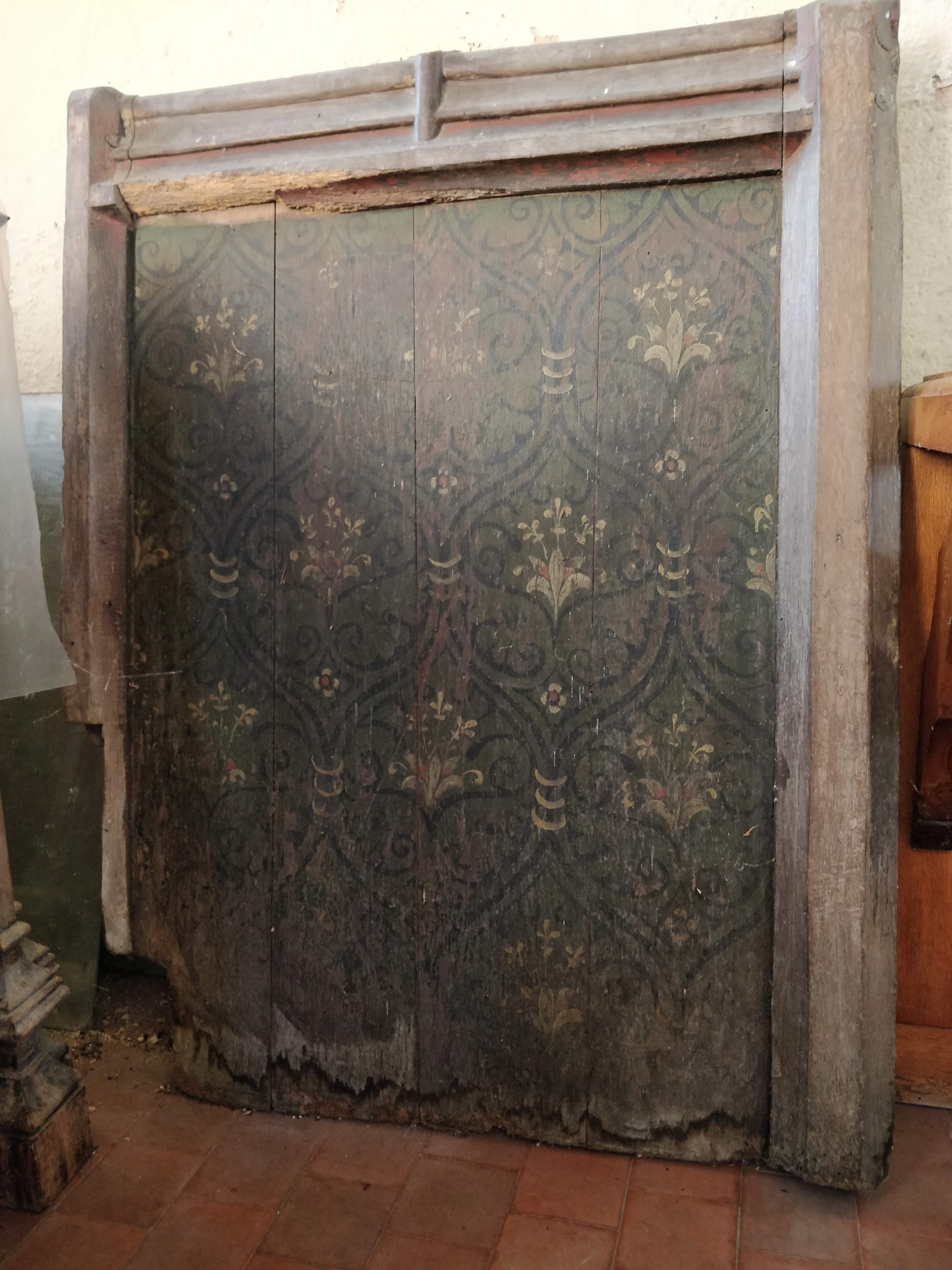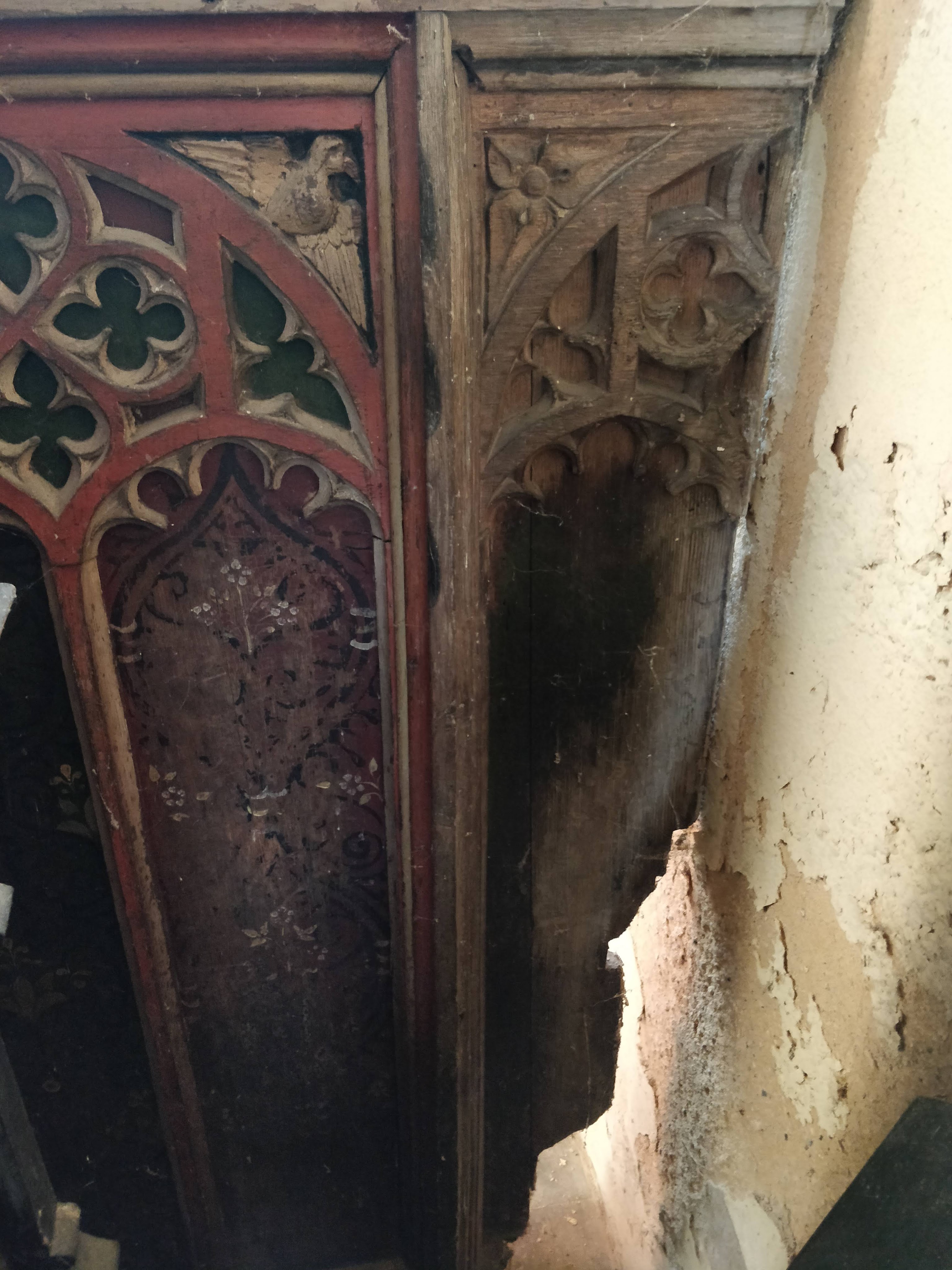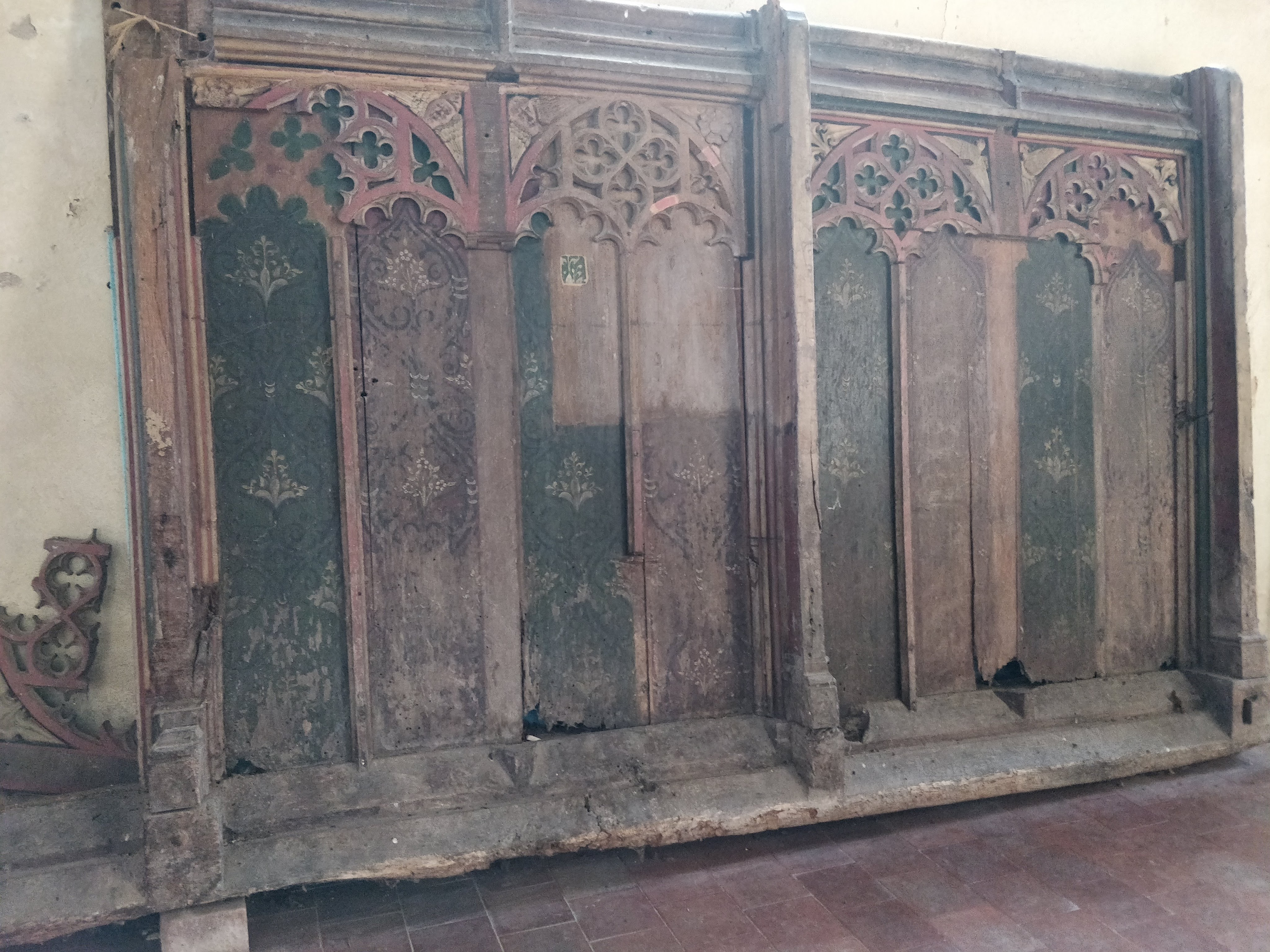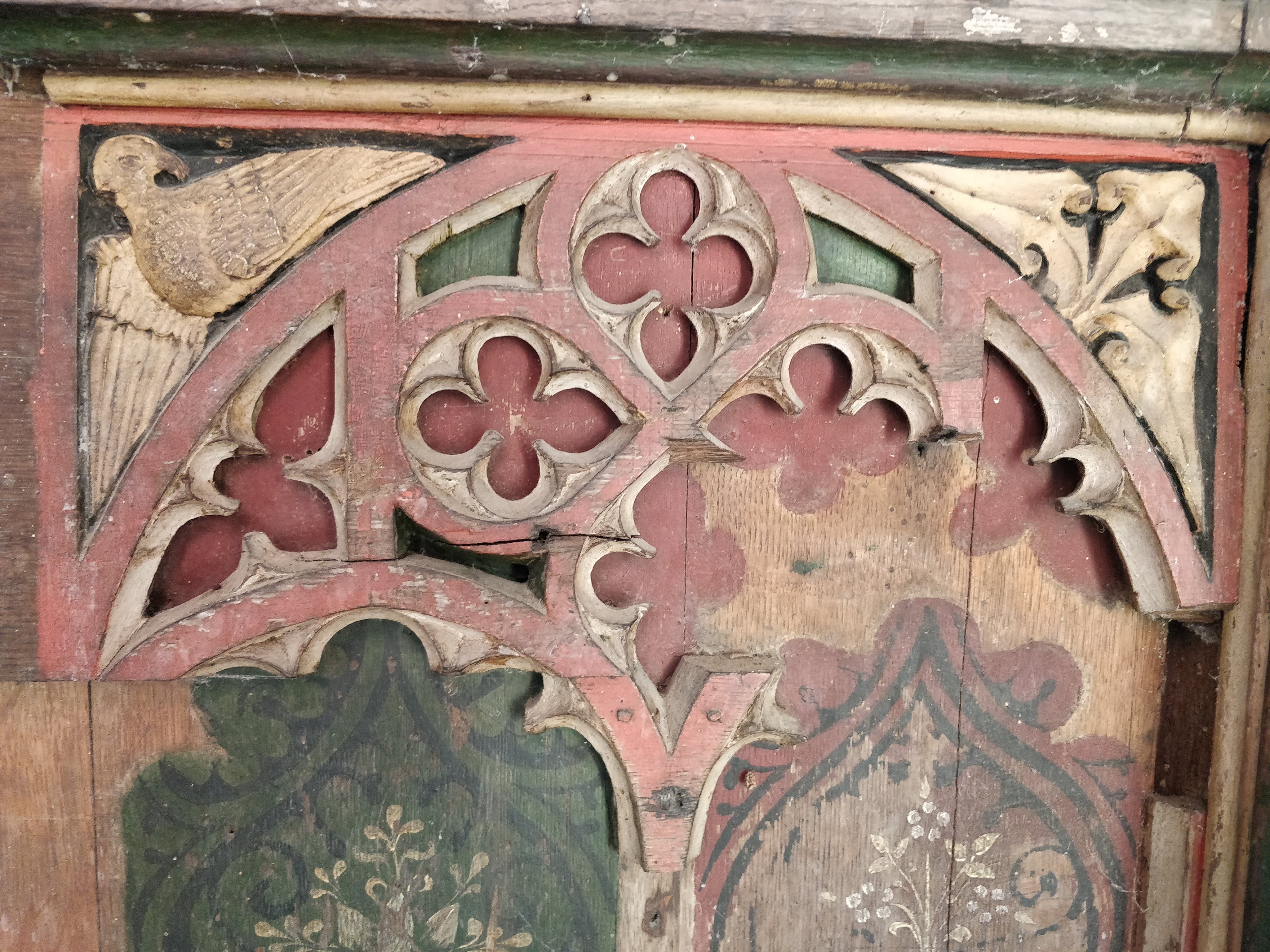 There are currently 3 painted dado screens, a loose painted piece of tracery, and some unpainted tracery that has been re-used in an altar in the church. One dado section, consisting of 3 ½ panels, has been re-used as a divider in the south transept. It has had half of the right hand panel cut off to fit tightly against the wall as the divider. Another 2-panel dado section is resting against the wall close by. This section does not have any tracery (nor evidence of such), as do the other panels, and therefore may not be from the same section of screen as the other pieces; however it has a closely related decorative scheme, and is probably from the same church. Another 3-panel section is currently resting against the south wall, the lower transom of which extends out to the left (but in a fragmented state), and with the small piece of loose tracery resting against it. This section has very similar decoration and tracery to the piece being used as a divider, and therefore is very likely to be part of the same original screen. The small piece of painted tracery is similar in design and colouring to the tracery on the 3-panel sections, but there is no tracery missing from these pieces.