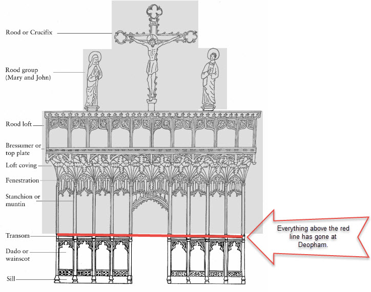 The rood screen itself looking from the back of the church towards the altar would have contained the elements shown in the drawing below by Lucy Wrapson5. The panels that remain have been cut off just above the transoms. The screen at Deopham would have been much wider than shown in this schematic.