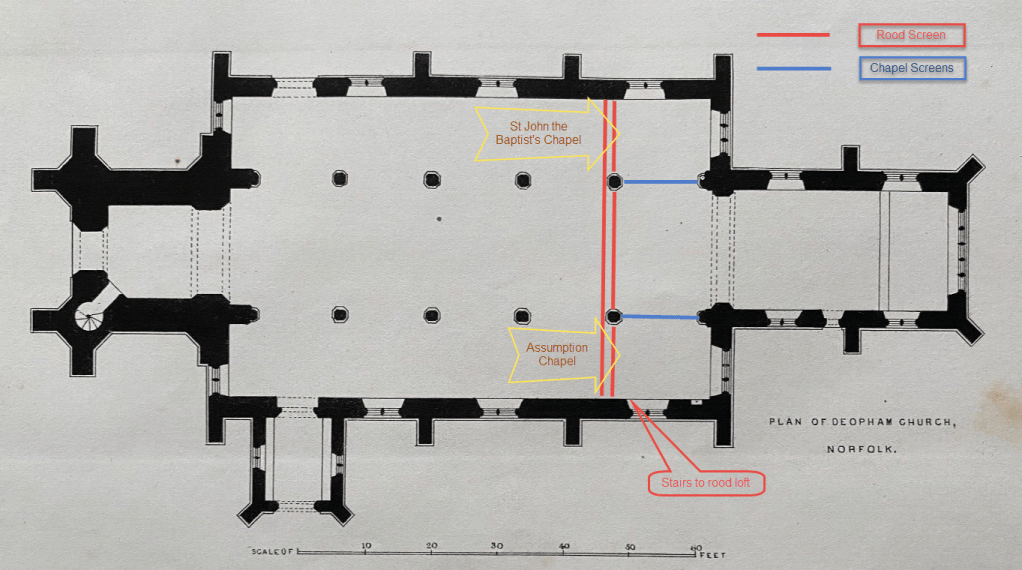 1. The rood screen running from south to north which would have divided the full width of the church (as is the case with the reinstated screen at Attleborough – see adjoining photo).