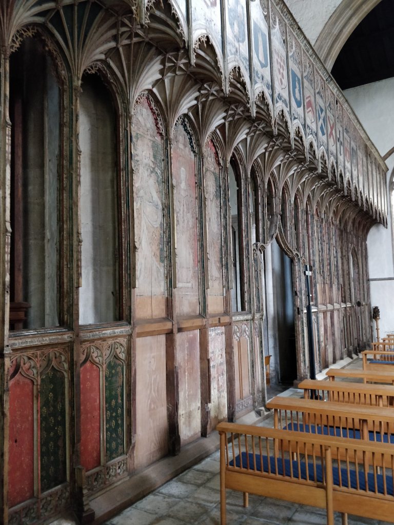 The directories from 1864 and 1890 state that at that time there were still “remains of painted screens at the east ends of the aisles”.