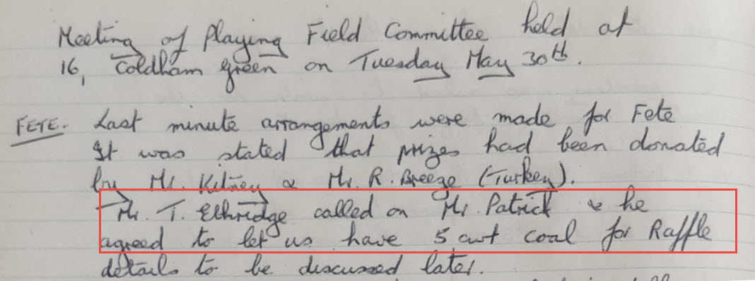 The Patricks donated a bag of coal to the Playing Field Committee for their fund raising, as recorded in this page from their minutes for the meeting of May 30th 1972: