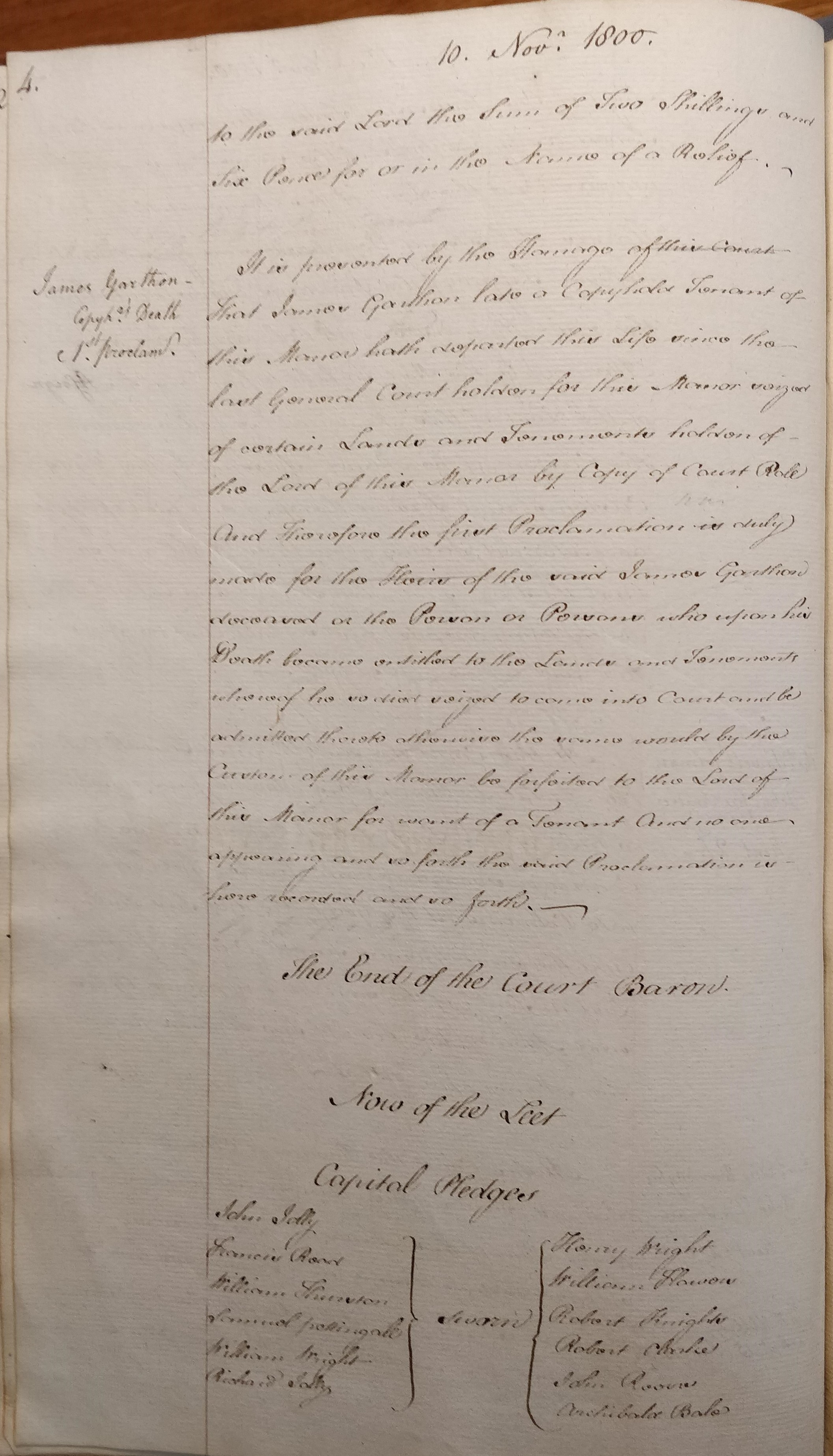 And therefore the first Proclamation is duly made for the Heirs of the said James Garthen deceased or the Person or Persons who upon his Death became entitled to the Lands and Tenements whereof he so died seized [=in possession of] to come into Court and be admitted thereto otherwise the same would by the Custom of the Manor for want of a Tenant And no one appearing and so forth the said Proclamation is here recorded and so forth. [The procedure was that the proclamation would be made three times; if no heir came forward after the third proclamation, the property would revert to the Lord of the Manor for disposal as he saw fit.]