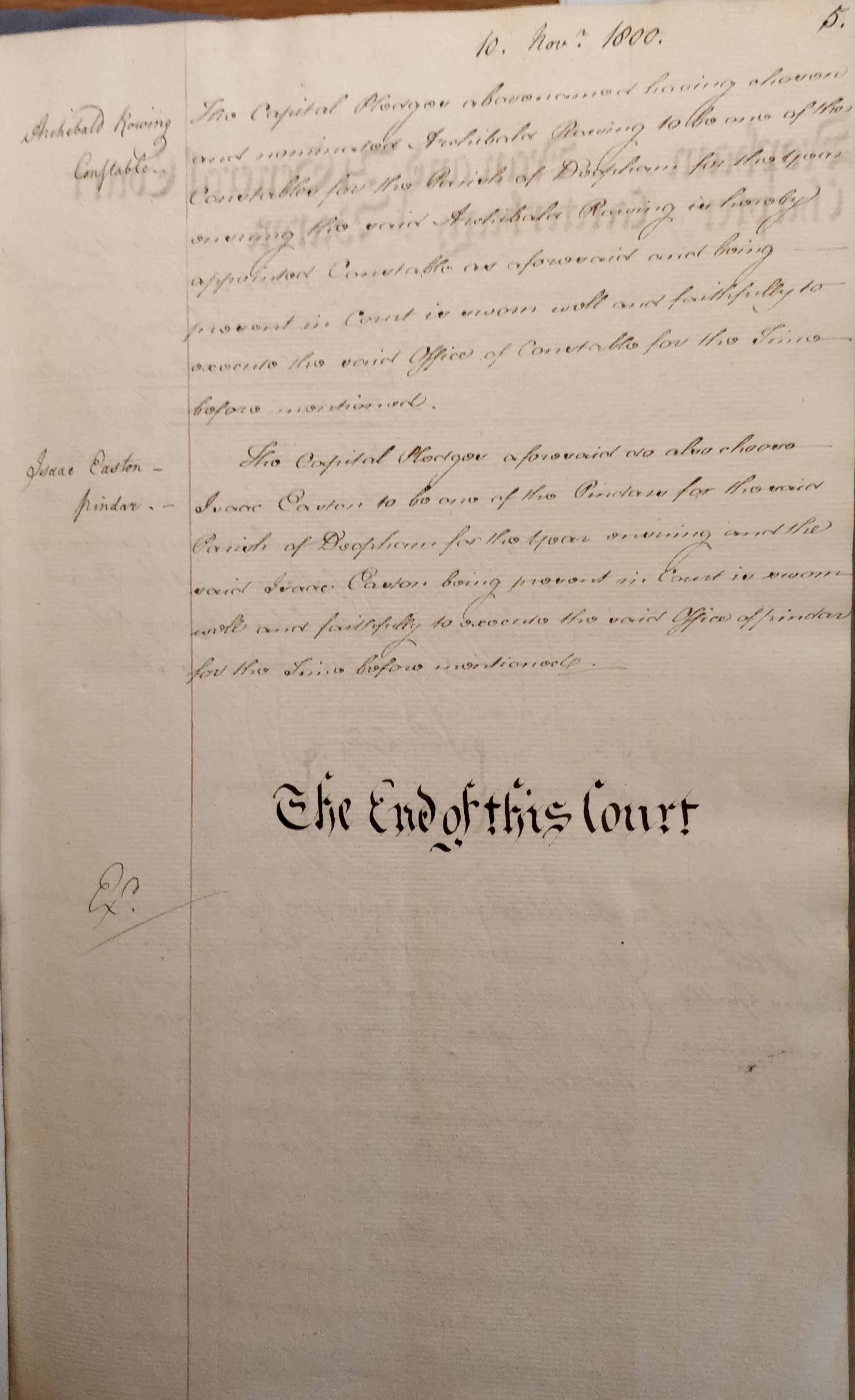 The Capital Pledges aforesaid do also choose Isaac Easton to be one of the Pindars for the said Parish of Deopham for the Year ensuing and the said Isaac Easton being present in Court is sworn well and faithfully to execute the said Office of pindar for the Time before mentioned.