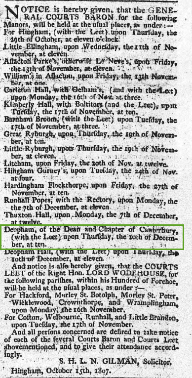 | Jonathan Dey (deceased) | April 28th 1791 on the surrender of John Cooper, Gentleman | George Browne Leake, eldest son of John Custance Leake of Holt, to be held in trust for John Browne | John Mitchell | 1) 1½ acres in Deopham Field; 2) ½ acre in Deopham Field | (included in the £16 above) | ||