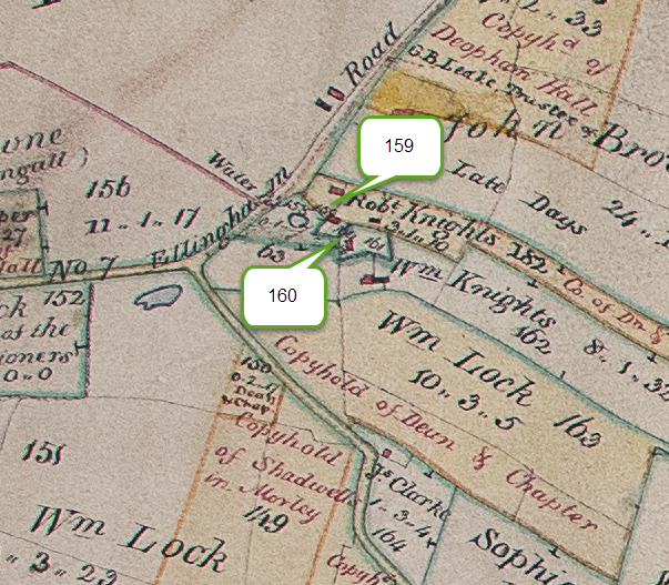 | Abraham Skipper the Younger, Labourer, in presence of Daniel Alexander the Younger; Witness: Thomas John Woodrow | April 7th 1814 | Garrett Oddin Taylor, Farmer, purchased for £15 from Abraham Skinner | Himself | Piece no 159 on the Deopham 1814 Inclosures Map (see below) containing 2 perches with a cottage bounded by Robert Knights, West and North, Charles Allen, East; Highways, South; | £1 | ||