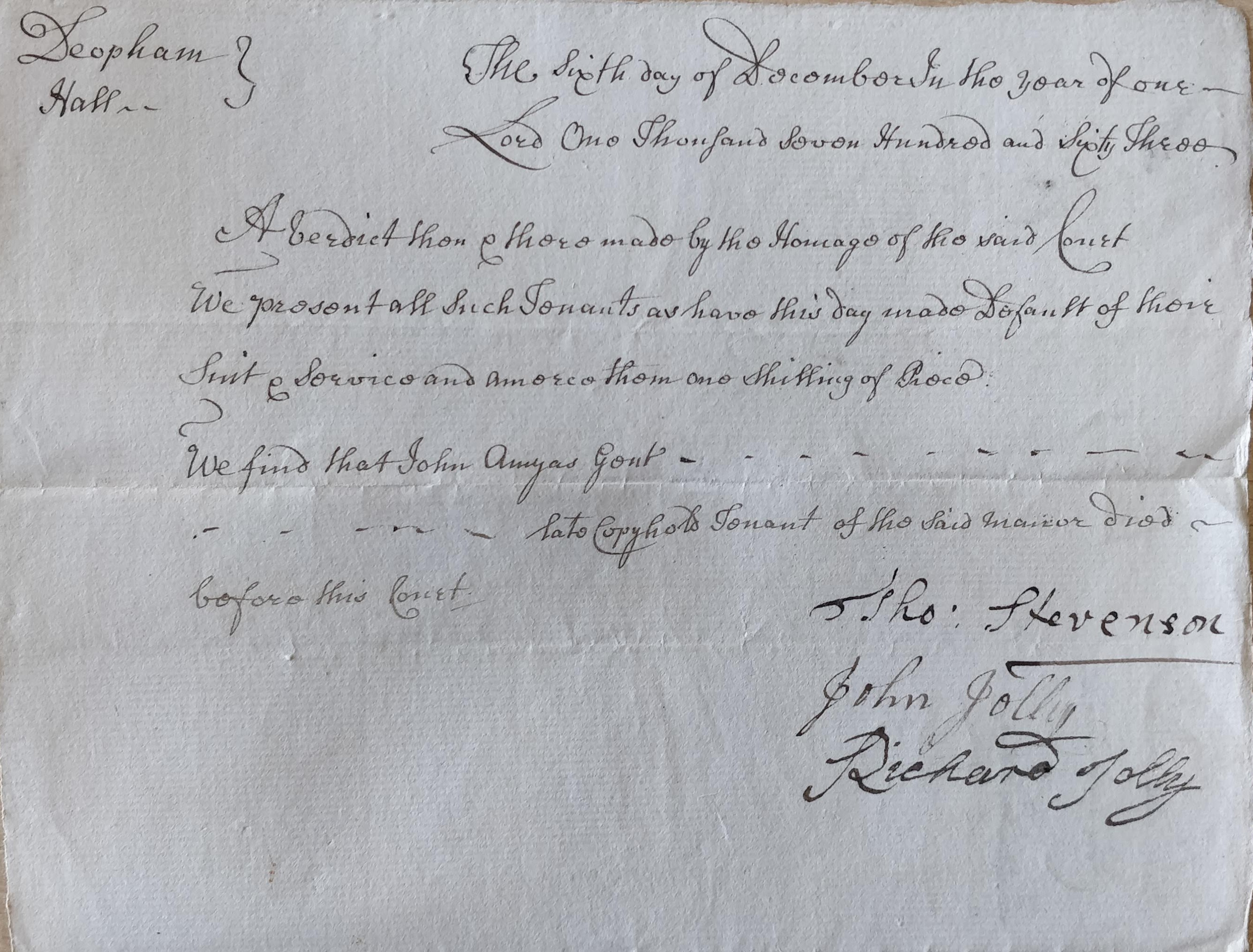 | John Amyas Gent (deceased) | October 27th 1730 following surrender by Christopher Notley | Anne Amyas | 1) 1 acre between Robert Underwood North; Lands of Shadwells South; a Common Way West; 2) 1 rood between Edward Burman West; lands of the Canterbury Cathedral East; a Way leading from Tungreen to the Church of Deopham North; 3) 1½ acres in Morley in 3 pieces: 3.1) 1 rood between lands late of John Wright & afterwards William Sedley Esquire East; lands late of Richard Raven & after John Pooley West; Palloway North; 3.2) 1 acre between William Childerhouse West; this Manor East; Palloway North; 3.3) 1 rood between lands late of Thomas Bliss now Robert Payne West; lands now or late of William Childerhouse East; Common Way North; 4) 1 acre between divers men West; lands of this Manor East in the tenure of John Cooper; Common Way South; 5) 3 roods in Church Field at Stone Hill between lands of Dean & Chapter of Canterbury North; Robert Underwood South; Lands of this Manor East; Common Way West; | £4 8s 6d | |||