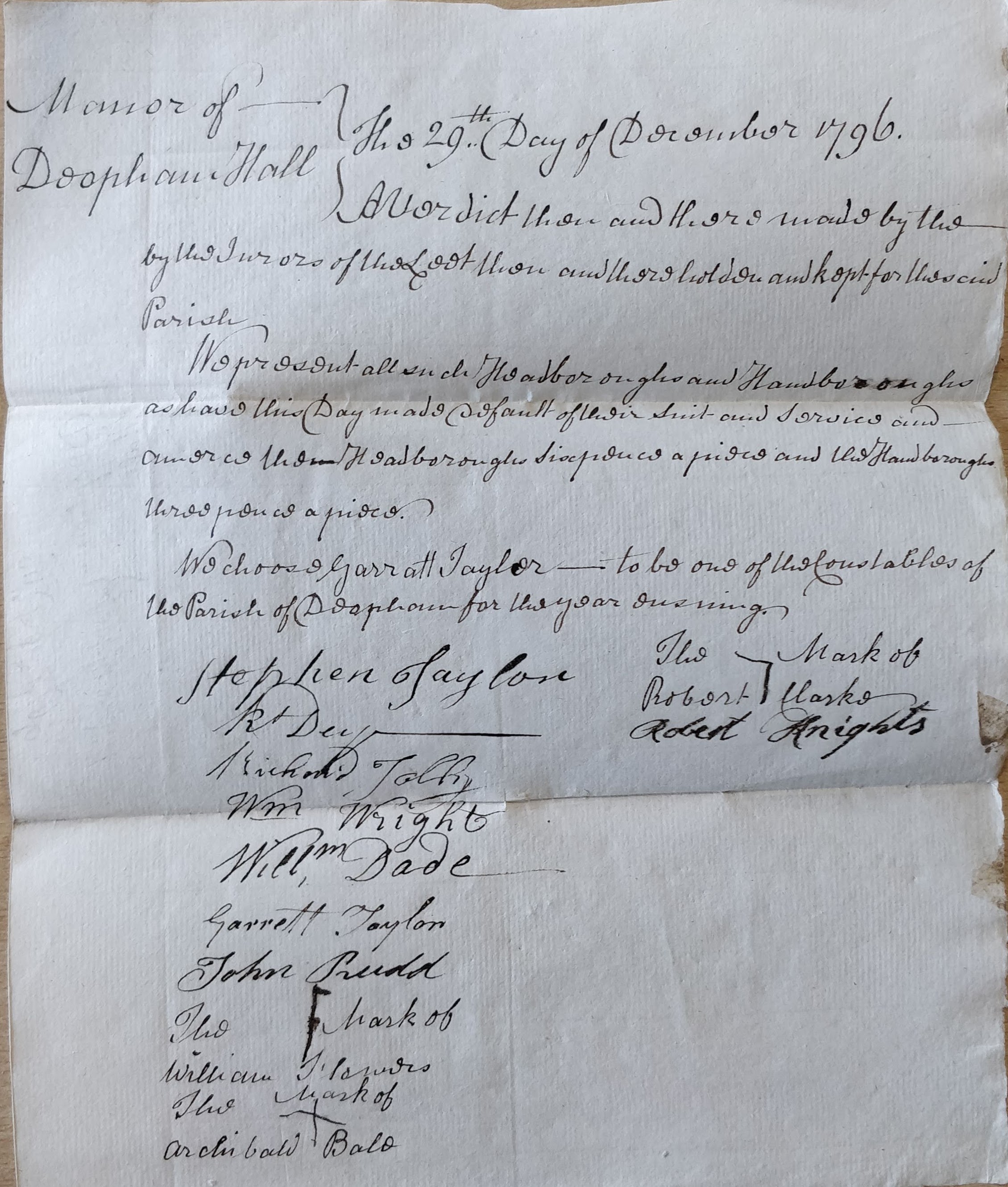 - The Handborough was the head of the household, responsible to the headborough for the good behaviour of his family, children, dependents and servants. ↩︎