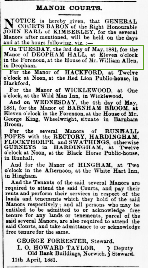 The 1881 census recorded William Allen and his family as living in Low Common, where he was described as a “Farmer of 223 Acres employing 6 men, 3 boys & 2 women”. Kelly’s 1883 Directory describes him as a “farmer & cattle dealer, Hall farm”. Mr. Michael Allen has advised that William Allen moved to Hall Farm in Low Common in 1875. It seems reasonable to conclude therefore that this Court took place at Hall Farm, Deopham.