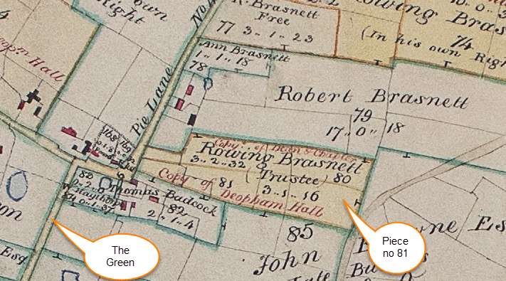 | May 3rd 1803 | Rowing Brasnett as Trustee according to his father’s Will | Himself | Before Inclosure: 1) 1½ acres at a place called Palloway; 2) 2 acres called Small Close; Inclosure Commission award: 1) 3 acres 1 rood & 16 perches – piece no 81 on the 1814 map; 2) 1 acre 1 rood & 37 perches – piece no 40 on the 1814 map.3 | None | |||