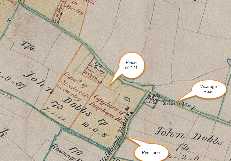 | November 28th 1804 upon surrender of John Buckle & Mary his wife | John Dobbs | Before Inclosure: 1) 1 tenement built & 6 acres of land in divers pieces in Deopham; 2) 1½ acres in 2 pieces in Deopham; Inclosure Commission award: 10 acres & 8 perches with a messuage & other buildings standing thereon – piece no 171 on the 1814 map.5 | None | ||||