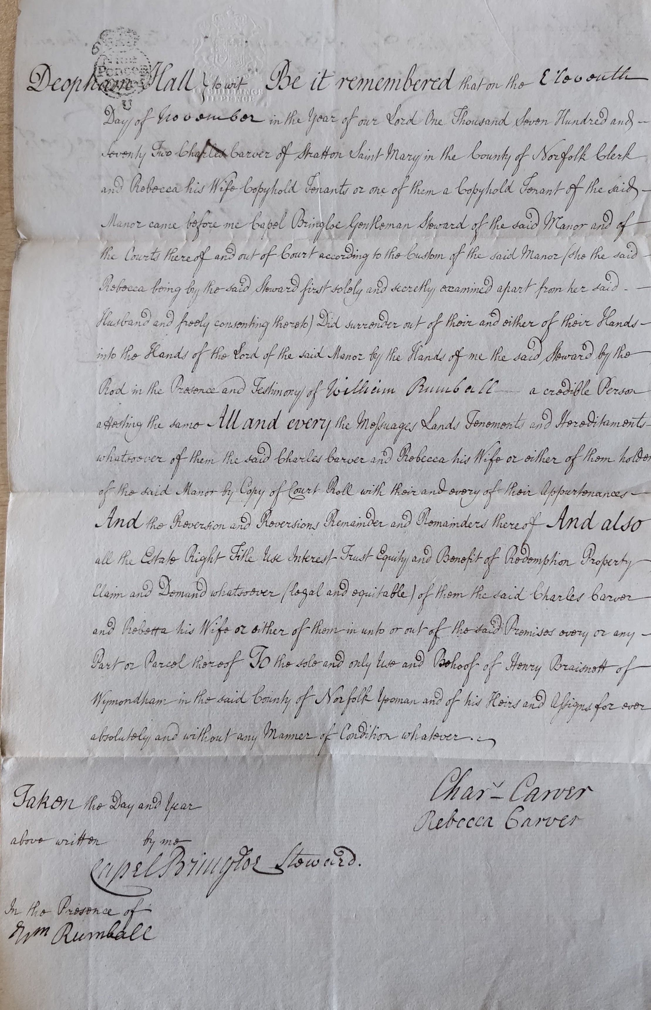 | Richard Jolly the Younger of Deopham, Farmer – conditional surrender | Charles Tyndall of Carbrooke, Yeoman, advanced a mortgage of £60 + interest | ||||||