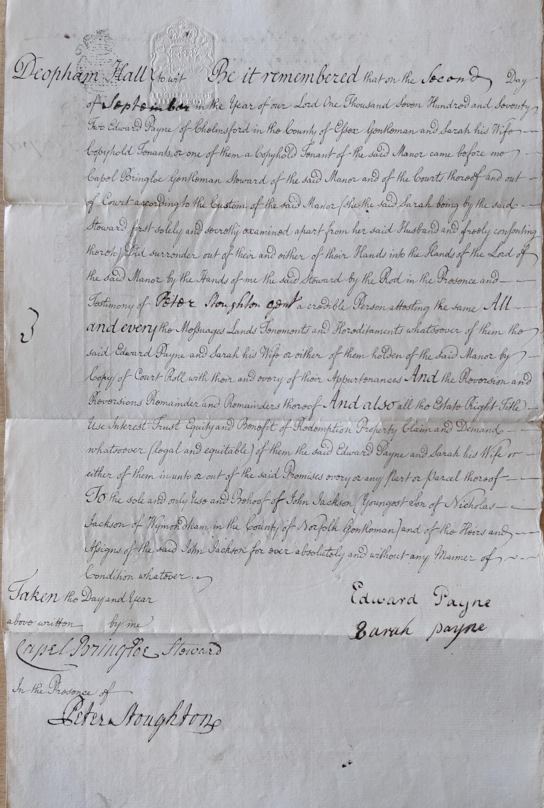 | Edward Payne & Sarah Payne his Wife of Chelmsford | November 17th 1747 following the death of John Payne, father of Edward Payne | September 2nd 1772: John Jackson, youngest son of Nicholas Jackson of Wymondham, Gentleman | Nicholas Jackson (his father) | 1) 1 acre of Copyhold land. part of Eight Acres & 1 rood in the Field of Morley between lands late of John Wright West; Shadwells East, Pallow Way North; Stephen [Baldwin?] South; 2) 2 acres of Copyhold land in Morley Field between Stephen Baldwin West; John Amyas Gentleman East; Pallow Way North; divers men South. | £2 12s 6d | ||