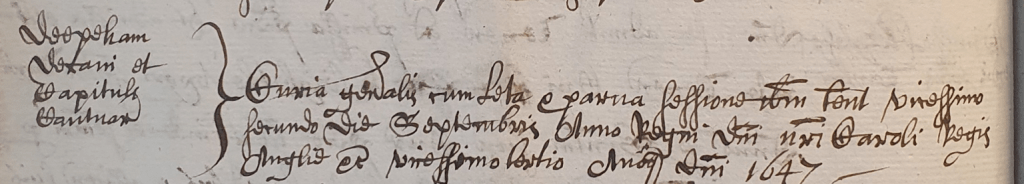 | June 25th 1647 Philip Corye, a customary tenant of this Manor, surrendered into the hands of the Lord Manor by the hand of Robert Newman, a customary tenant of this Manor, in the presence of Thomas Smith & George Brooke, also customary tenants. | October 1st 1??? Philip took to himself on the surrender of Robert Childrowse | Martha Corye, widow & relict of Philip Corye, according to the will of Philip Corye dated January 20th 1640 | Edward Cocke | ½ Messuage called Brownes in Woolewhite Streete in Deopham | 10s | ||