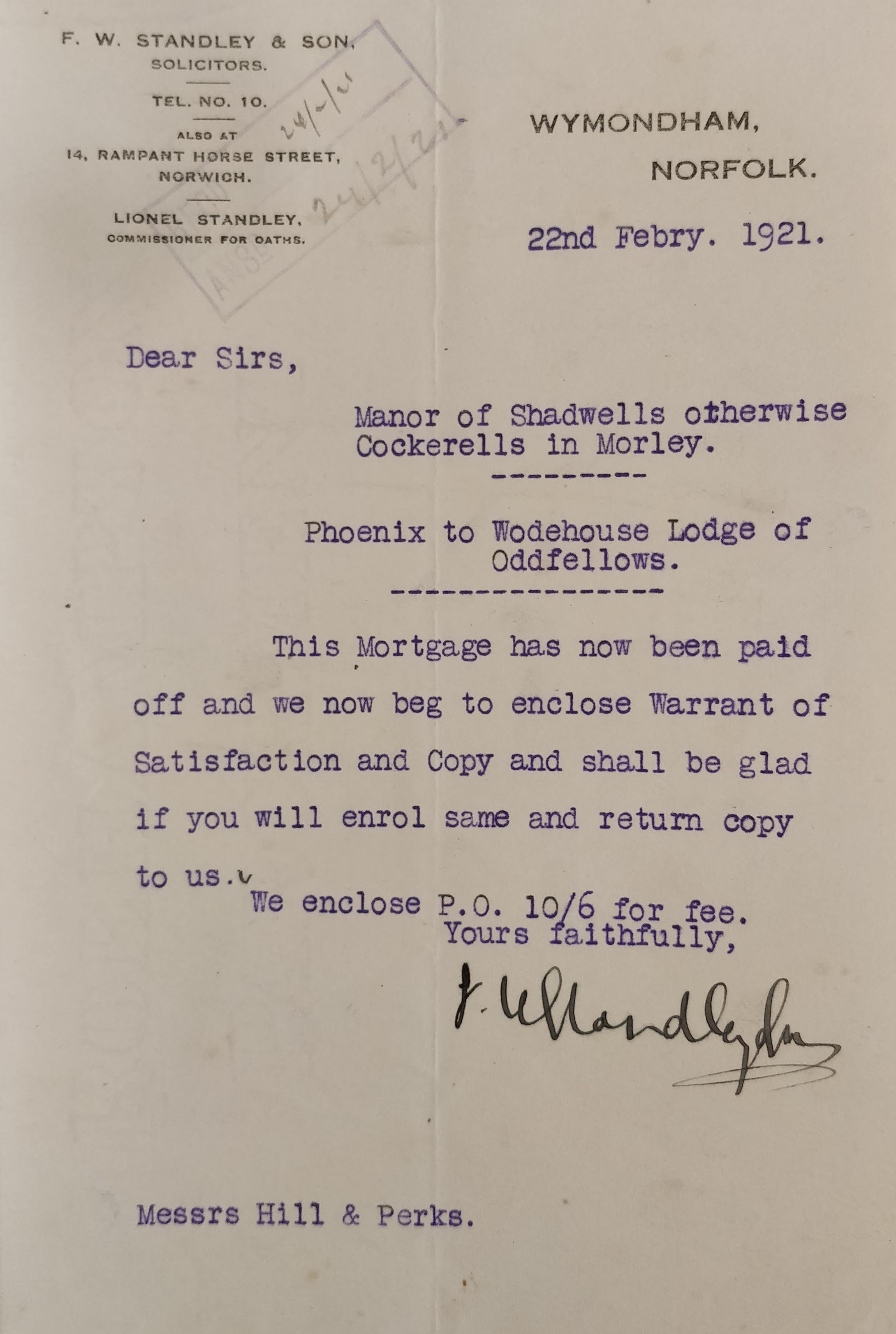 | Wodehouse Lodge of Oddfellows confirmed satisfaction of the mortgage issued January 3rd 19021 | Thomas Phoenix | 1) 4 acres, 2 roods & 3 perches; 2) 2 acres, 1 rood & 22 perches both pieces in Hackford2 |