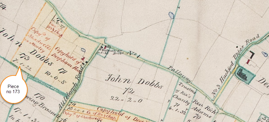 | Mary Lane of Deopham, Widow, & John Lane of Hingham, Miller surrendered this property for £490 for the Copyhold part, out of a total of £2,050. | September 5th 1846 according to the will of Andrew Lane (deceased) | William Miles of North Tuddenham, Farmer | Thomas Sutton | Piece no 173 on the Deopham 1814 Inclosures Map containing 7 acres, 1 rood & 22 perches3. | 5s 3½d | £18 | |