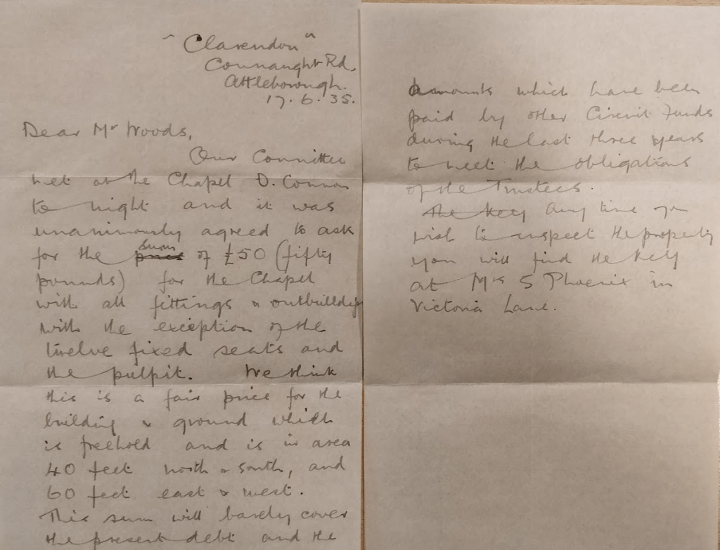 A letter from the Methodist Chapel Aid Association dated April 21st 1943 records that the principal and all interest on the chapel’s loan had been paid off following the receipt of a payment from Mr. E.A. Harvey. Mr. Harvey was one of the circuit stewards mentioned when the trustees resolved to sell the chapel in 1935.