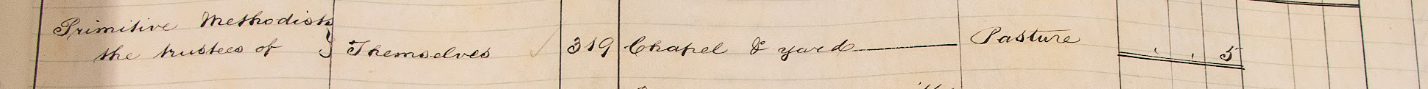 This survey with its corresponding plan lists plot 319 (outlined in green below) as being owned by the Trustees of the Primitive Methodists and occupied by themselves; it is described as “Chapel and Yard”:-