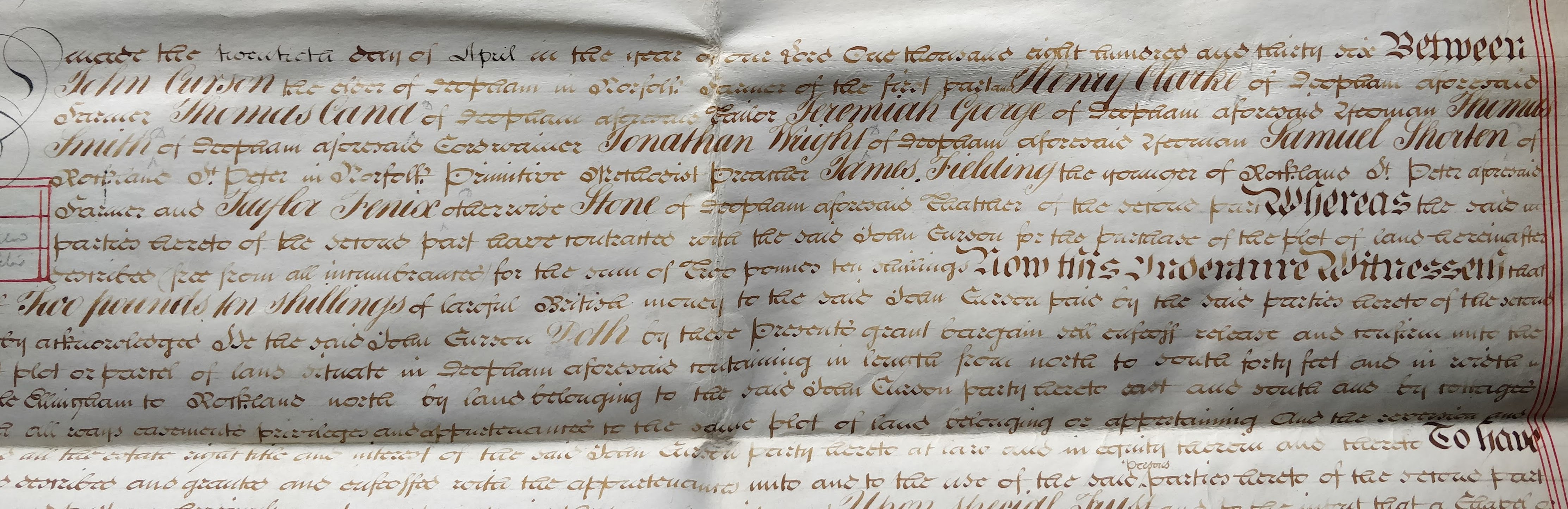 The plot is described as 40 feet from north to south and 30 feet east to west. The sale took place with “the intent that a Chapel or Meeting House and School shall be erected thereon by the members of the Primitive Methodist Connexion resident at Deopham aforesaid and the neighbourhood thereof”.