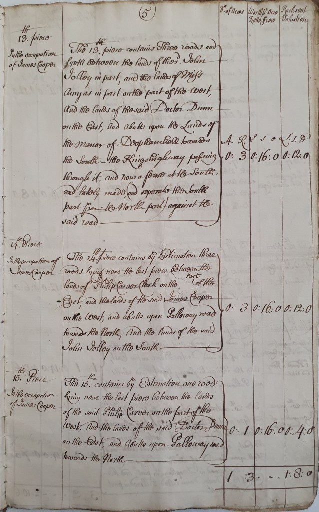 | 14 | Lies near to piece no 13 | James Cooper | 0a 3r | Philip Carver (Clerk) | James Cooper | Palloway road | John Jolly |