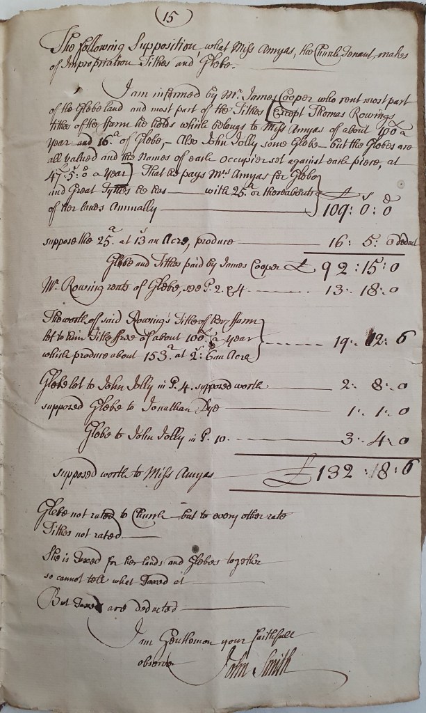 | 11 | Piece called Squires | Let to Thomas Rowing from Mrs Amyas | 6a 0r | John Jolly | King’s Highway | Mr Lane (Clerk) | Late Mr Andrews in occupation of John Fulcher |