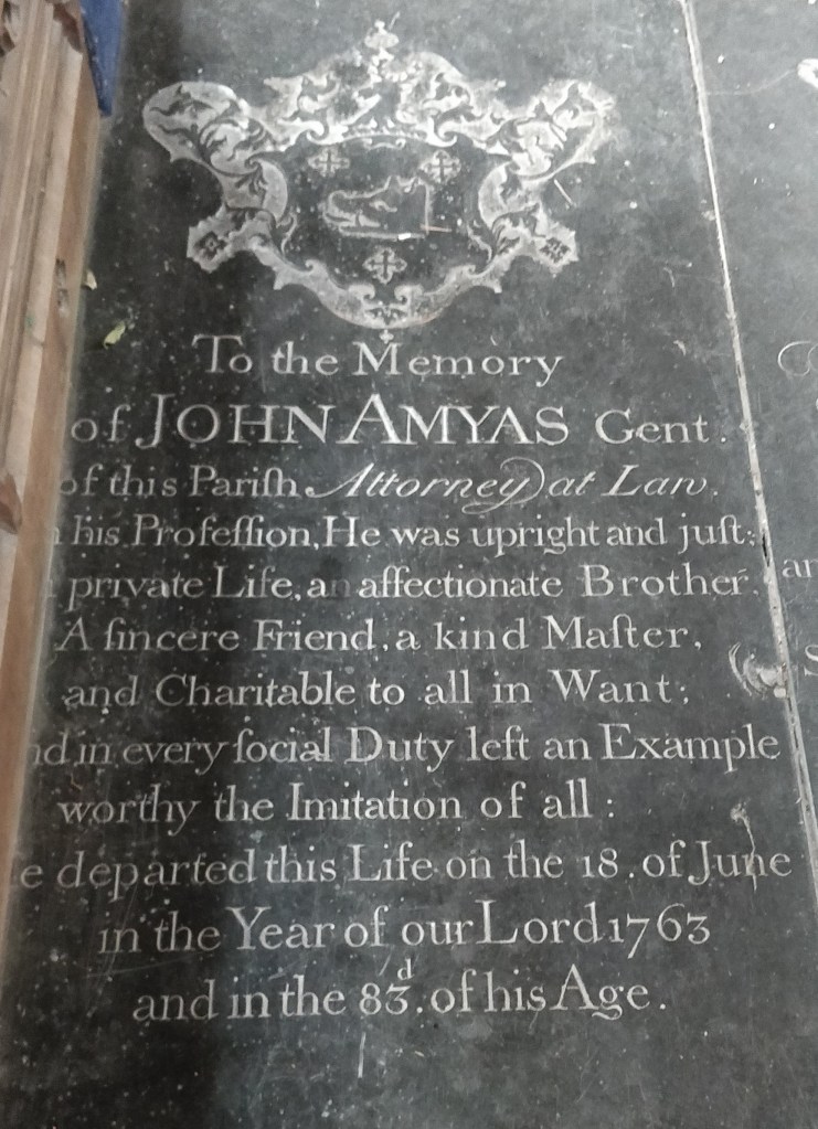 John Amyas died on June 18th 1763 and is buried in Hingham where there is a memorial in the chancel.