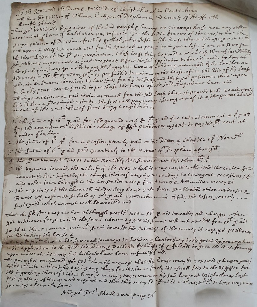 The humble petition of William Cullyer of Deopham in the County of Norfolk, Clerk, humbly showing that your petitioner being vicar of the said parish & having no vicarage house nor any other convenient place of habitation was enforced (for the better Service of the cure) to hire the Impropriation of Deopham aforesaid still of your possession (the house thereto belonging not to be lett apart by itself) at a rack-rent for the space of 21 years (to his great loss) of one Mr Bragg the then Lessee of the said Impropriation, whose lease being Expired a new Lease thereof (notwithstanding your petitioner’s importunate request two years before the said expiration to to have it made to him at the usual fine) was granted to one Mr Augustine Crow of London & managed by his brother an Attourney in Norfolk by whom your petitioner was persuaded to continue in the house after the End of his lease whereby he became obnoxious to law suits for his trespass, and that your petitioner thereupon to buy his peace was enforced to purchase the Lease of the said Augustine Crow and that your petitioner paid thrice as much for the said Lease than it proved to be really worth had it been a Fee simple estate, the severall payments issuing out of it & the great abatement of the rent thereof since being considered as