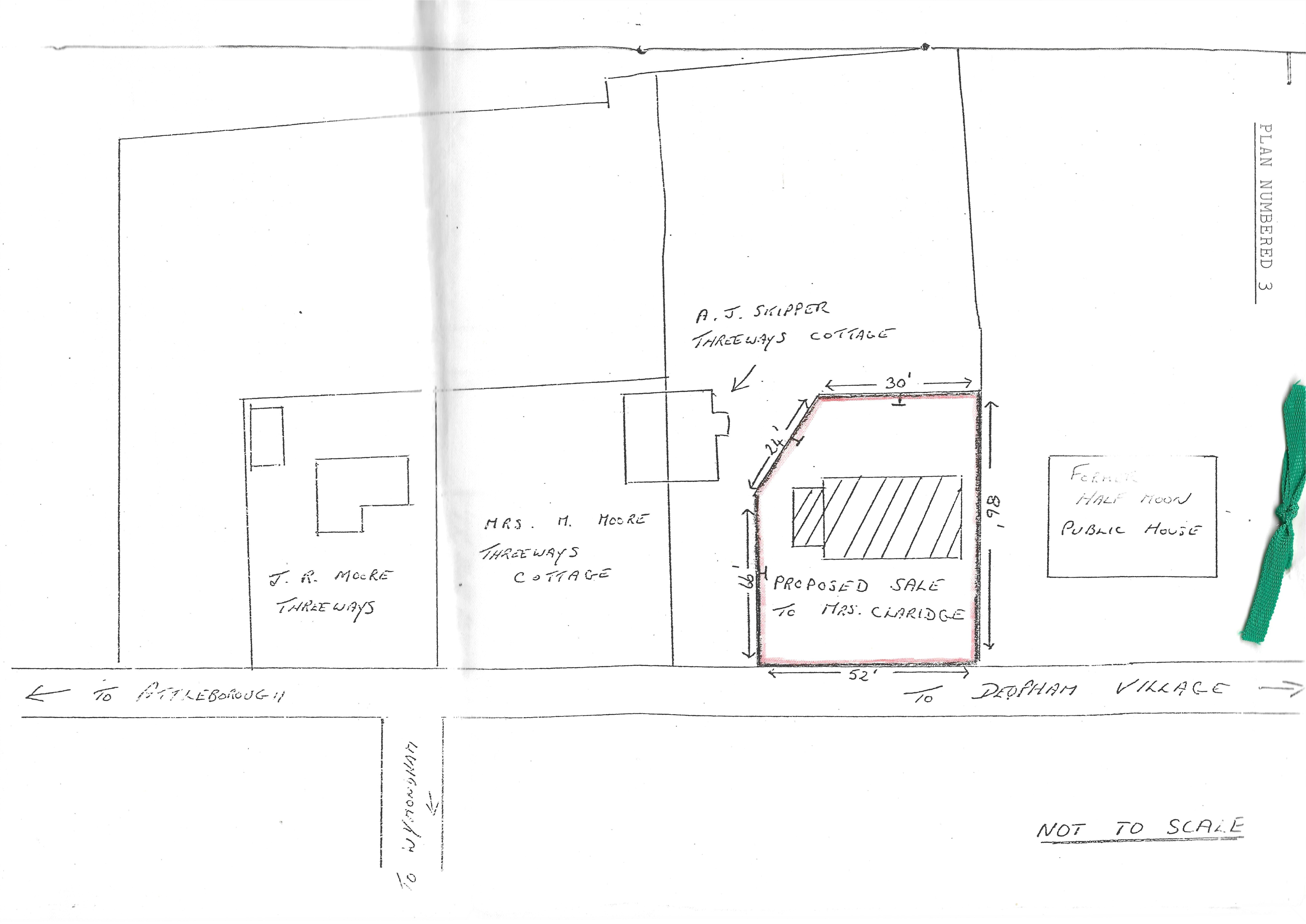The plan above shows that John Moore’s house was called Threeways, and the adjacent cottage was “Threeways Cottage”. Mrs M. Moore was living in the left side, and A.J. Skipper in the right hand half.