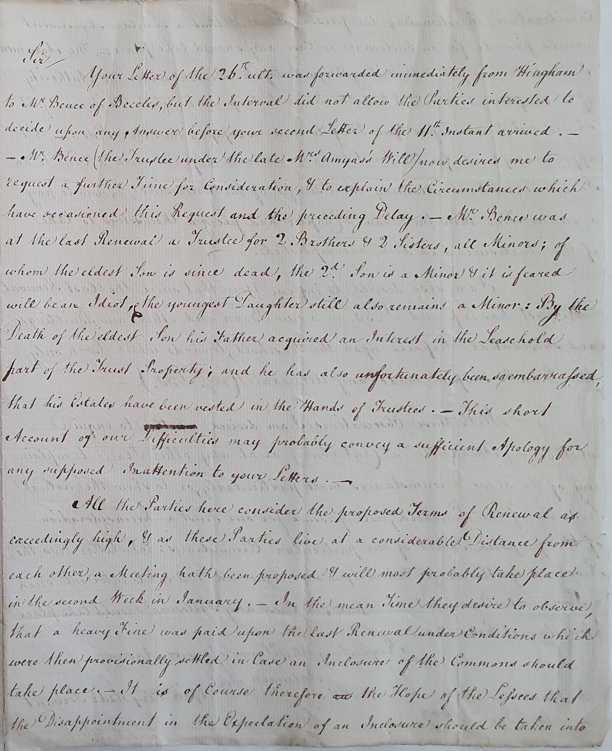 Mr. Bence (the Trustee under the late Mrs Amyas’s Will) now desires me to request a further Time for Consideration & to explain the Circumstances which have occasioned this Request and the preceding Delay. Mr. Bence was at the last Renewal a Trustee for 2 Brothers & 2 Sisters, all Minors; of whom the eldest Son is since dead, the 2d Son is a Minor & it is feared will be an Idiot & the youngest Daughter still also remains a Minor. By the Death of the eldest Son his Father acquired an Interest in the Leasehold part of the Trust Property, and he has also unfortunately been so embarrassed that his Estates have been vested in the Hands of Trustees, This short Account of our Difficulties may probably convey a sufficient Apology for any supposed Inattention to your Letters.