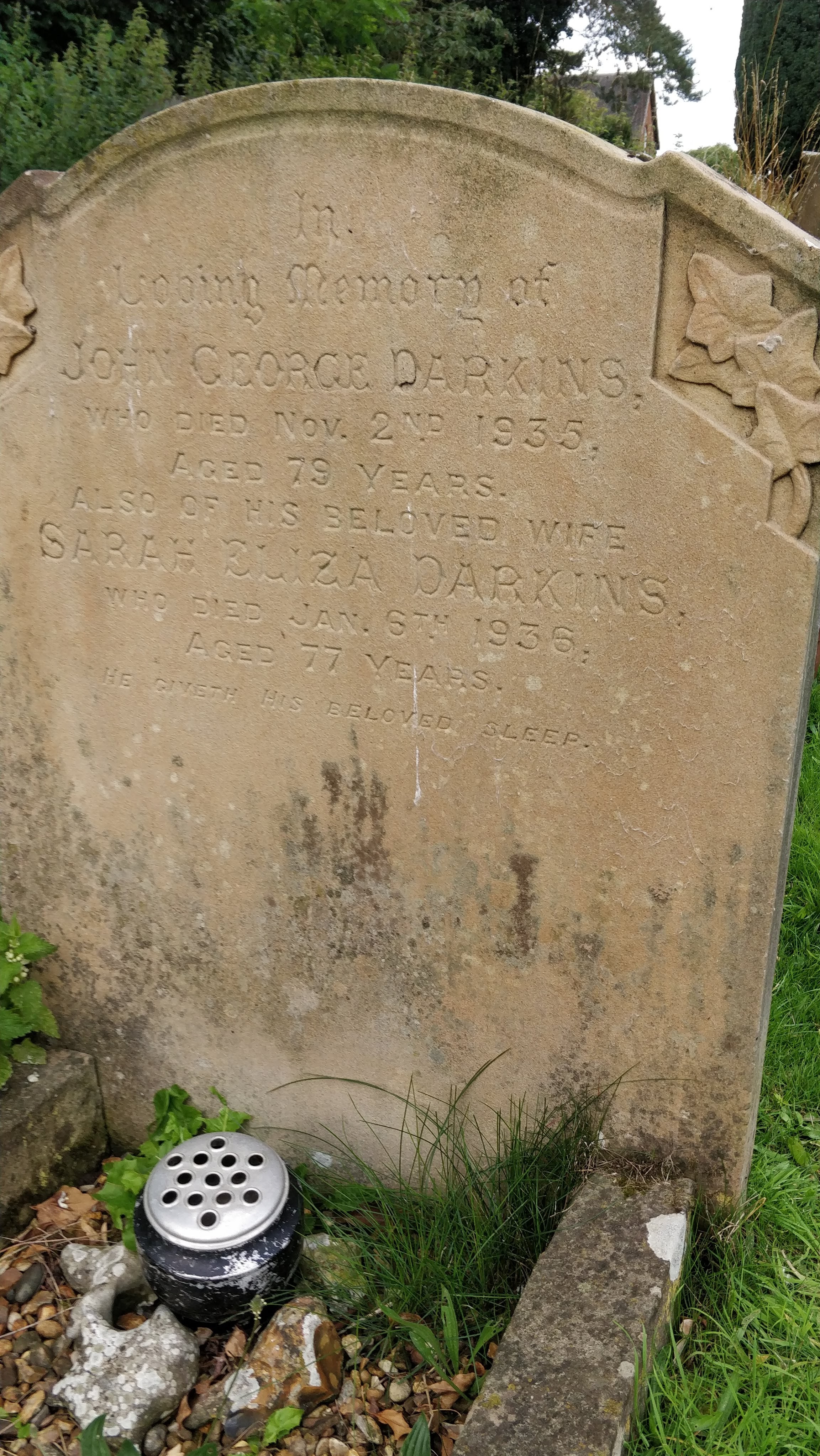 | ERIC ALFRED JOHN DARKINS Born 27th June 1930 Died 24th November 2004 also Wife RUBY IRENE Born 14th January 1934 Died 30th May 2019 | IRENE REBECCA DARKINS Born 7th January 1908 Died 19th January 2001 | JOHN GEORGE DARKINS Died 2nd November 1935 Aged 79 also Wife SARAH ELIZA DARKINS Died 6th January 1936 Aged 77 B41 ![]() | PERCY EDMUND DARKINS 1901 – 1979 |