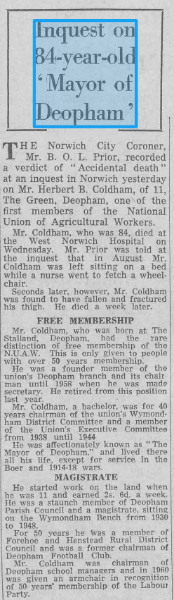 The “Mayor of Deopham” was 80 yesterday. Holder of this unofficial title is Mr. Herbert Coldham, veteran soldier, farm worker and local representative. As a soldier Mr. Coldham fought in the Boer War with the Norfolk Regiment. He rejoined the colours at the outbreak of the first World War and fought with his regiment in France and Turkey. He was wounded in the knee at Gallipoli. He joined the Home Guard in the Second World War in the first week of its existence.