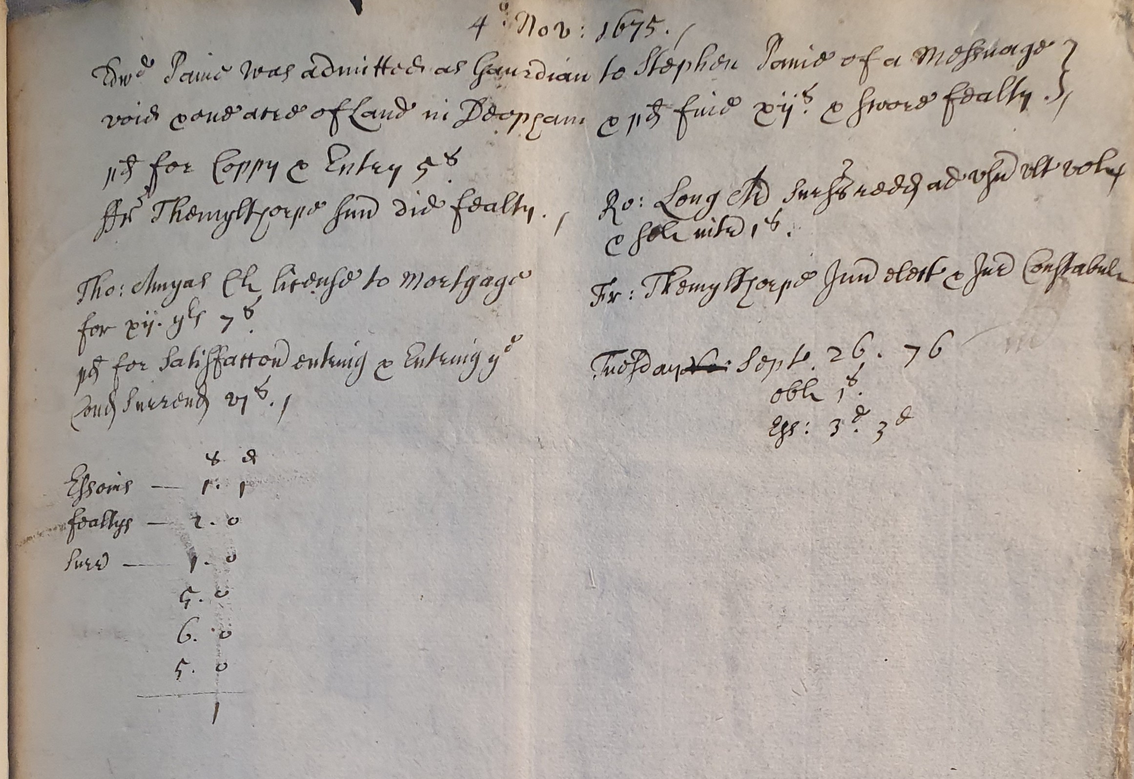 | Edward Paine was admitted as Guardian to Stephen Paine of a void messuage void and one acre of land in Deopham and paid a fine of 12s & swore fealty | 12s | ✔ |