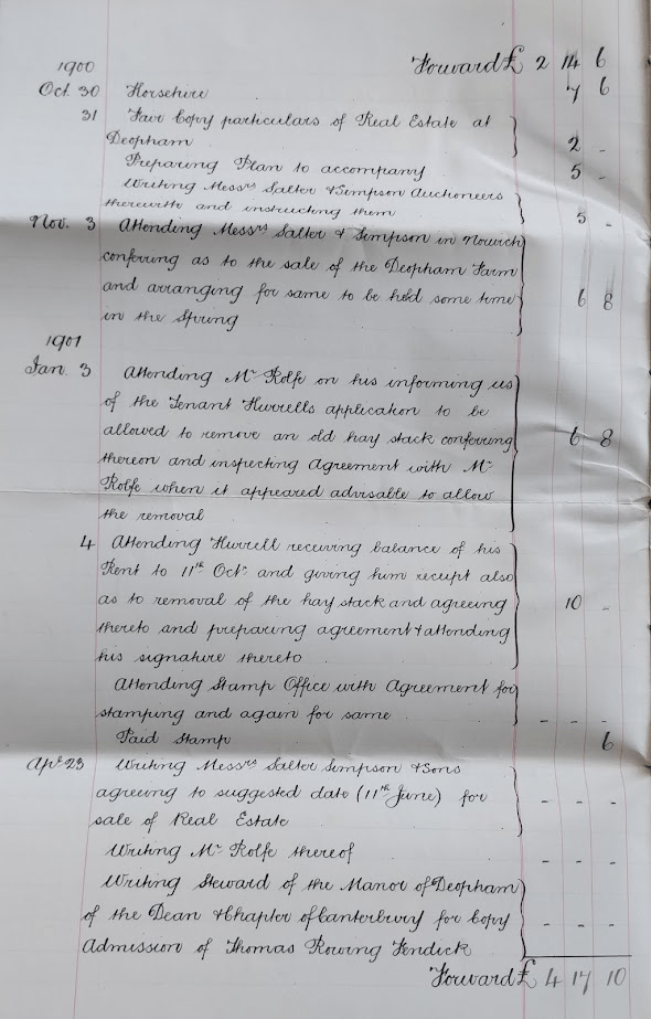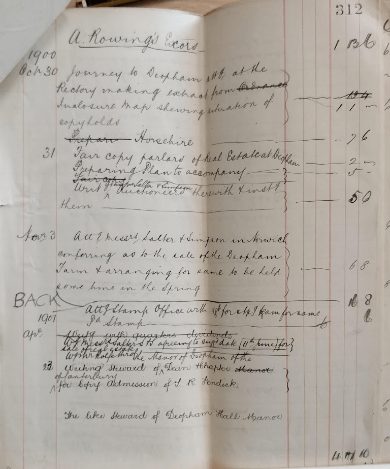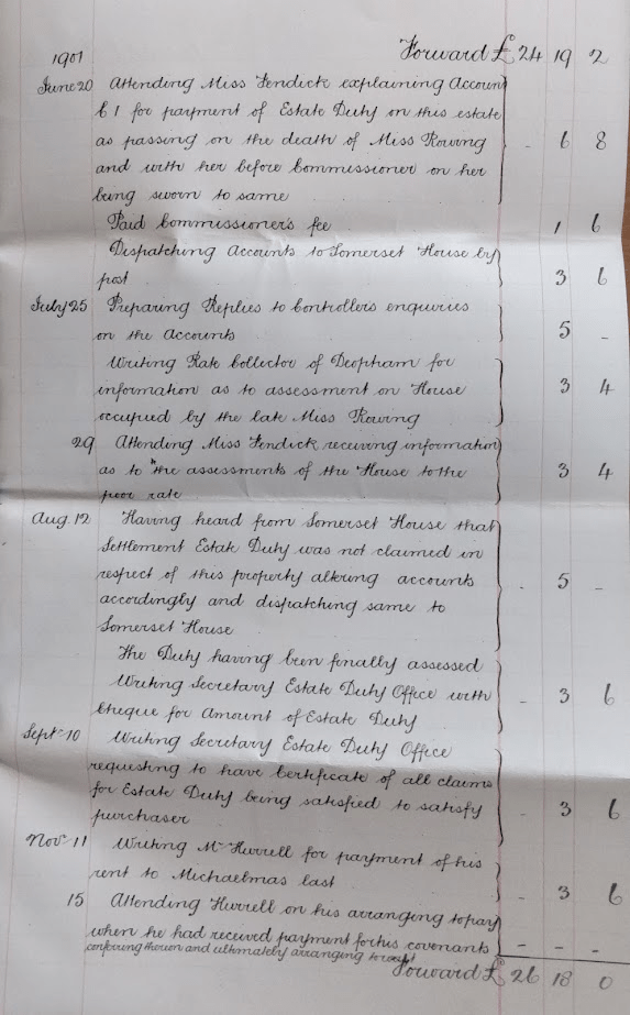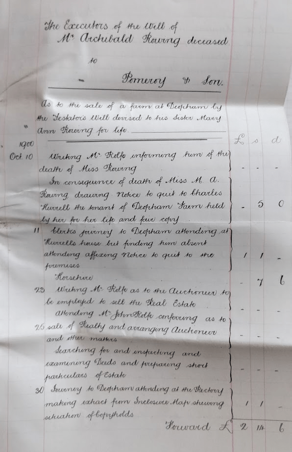 The following is an office copy of the costs of settling Mary Ann Rowing’s affairs; the formal version is to be seen in the first two pages of the official statement reproduced below this page. Note the 7/6d for “Horse hire”.