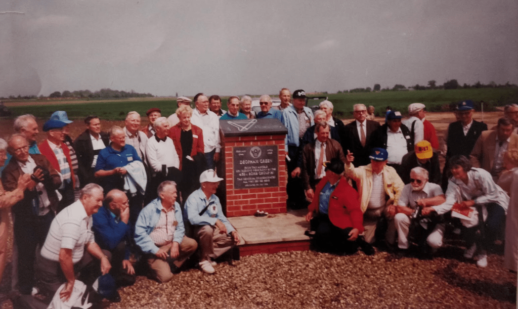 On the Friday of that weekend, May 15th 1992, the memorial on the site of the airfield was dedicated. It is to be noted that the memorial is dedicated to “all who served here”. The following image shows the gathered veterans at this dedication: