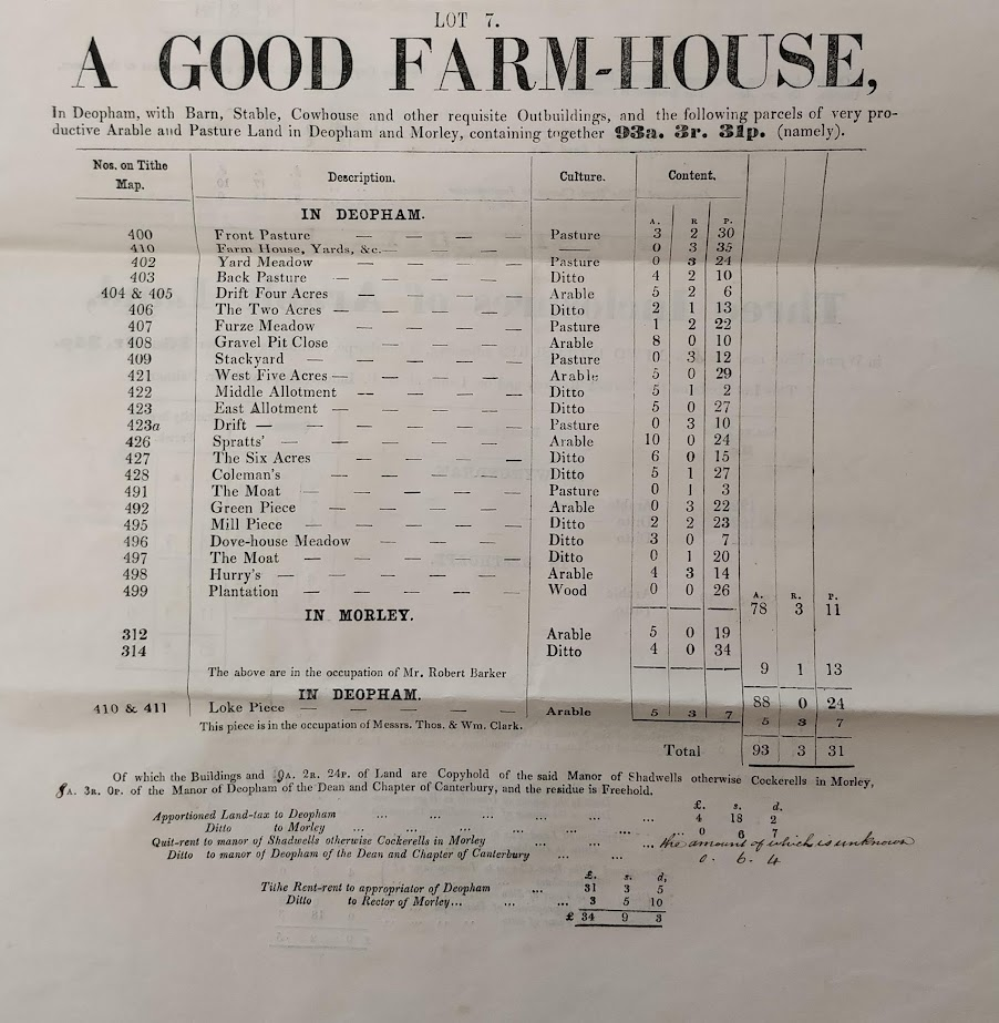 The 1814 Inclosures map for Deopham recorded Mill Farm as being in the ownership of John Browne, Esquire, and prior to that of Sparkhall. It was shown as being copyhold of the Manor of Shadwells otherwise Cockerells in Morley.