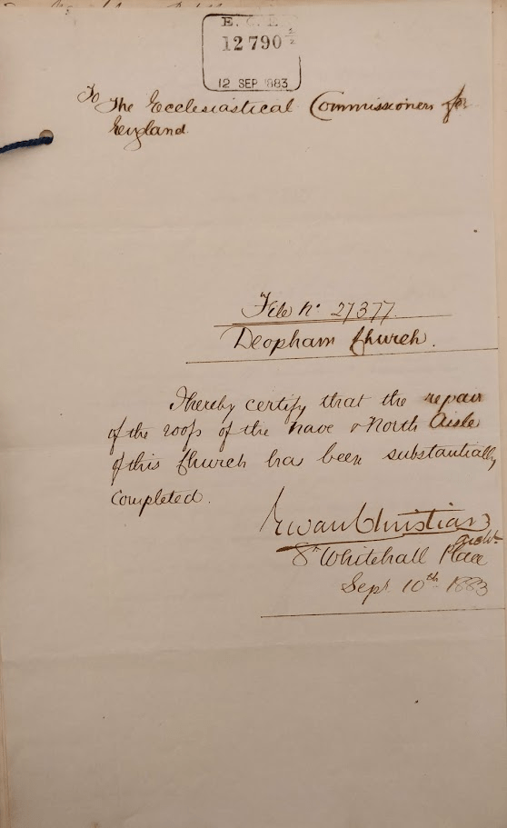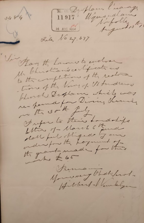 Raising funds for the Chancel repairs of 1864 had been relatively easy since they had been financed partly by the lessees of Deopham Manor, and partly by the Ecclesiastical Commissioners. There was no particular burden placed on the vicar, the Rev. Hibbert Wanklyn. However, it was down to him and the churchwarden to raise the funds to cover all the other restorations. Raising funds specifically for the Nave Roof restoration started in earnest with the issuing of a circular in 1881. Full details of the circulars issued and some of the associated correspondence is presented here.