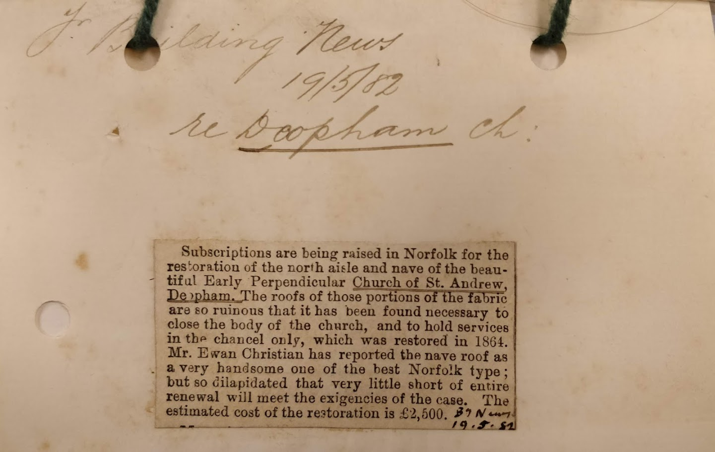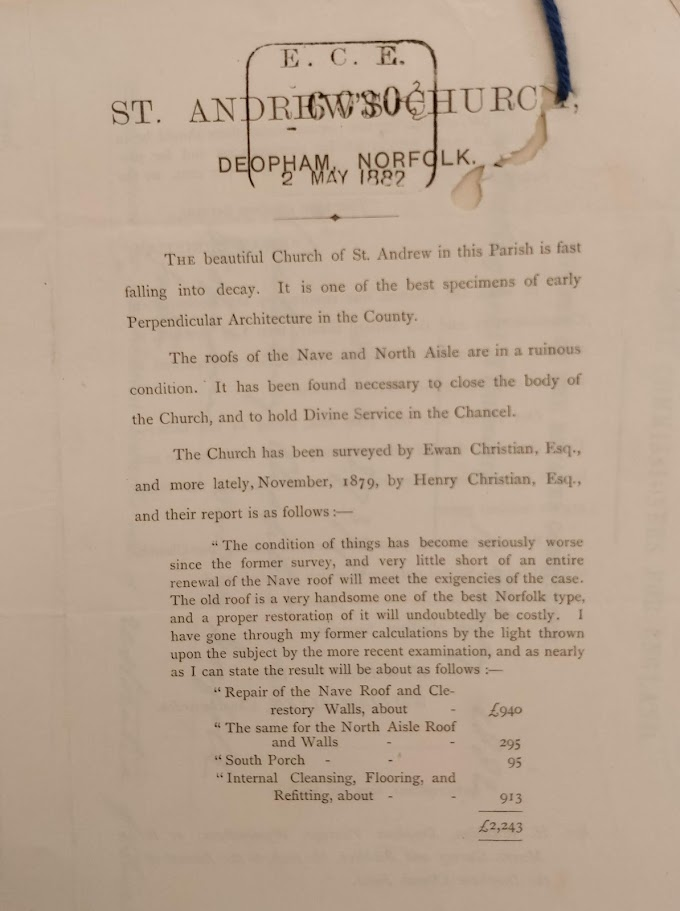 By the kind permission of Mrs. Hurnard, a bazaar was held on Thursday in buildings attached to Gurney’s Manor, Hingham, in aid of the fund now being collected for the restoration of the splendid old church of St. Andrew, at Deopham. Fortune favoured the undertaking, for the late gloomy wet weather gave way to a lovely day, which had the effect of drawing numerous kind friends to purchase at the stalls, which were supplied with every variety of useful and ornamental articles. The stalls were six in number. Miss Hurnard presided over the first, which was entirely entirely filled with beautiful specimens of Valerie ware, Mrs. Beevor and Mrs. Shaw undertook the plain work stall; Miss Wanklyn, Miss D. Griffith and Miss Beville, the fancy stall; Miss Griffith and Miss G. Wanklyn, the book and picture department; Miss G. Evans, and Miss Maud Wanklyn, the doll stall; the Rev. Duncan Tovey, the sale of plants; and Mrs. Wanklyn and Miss M. Harnard, the tea and refreshment department.