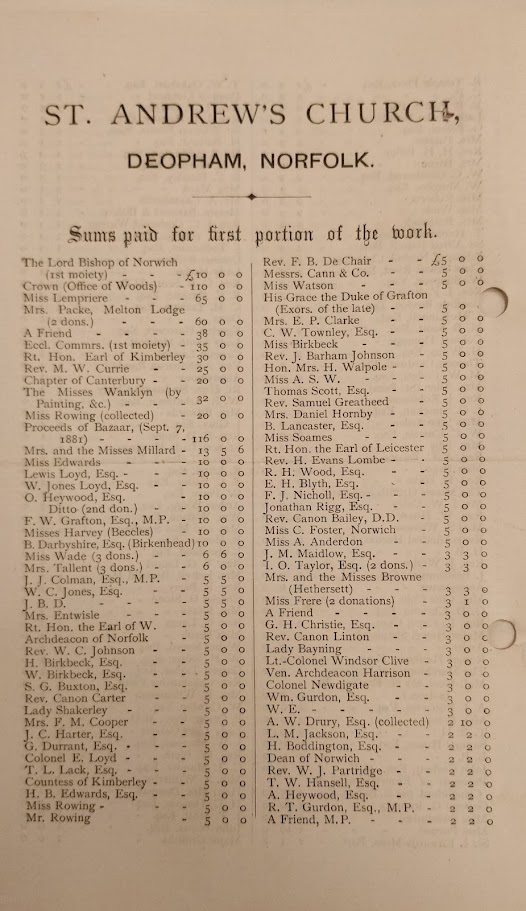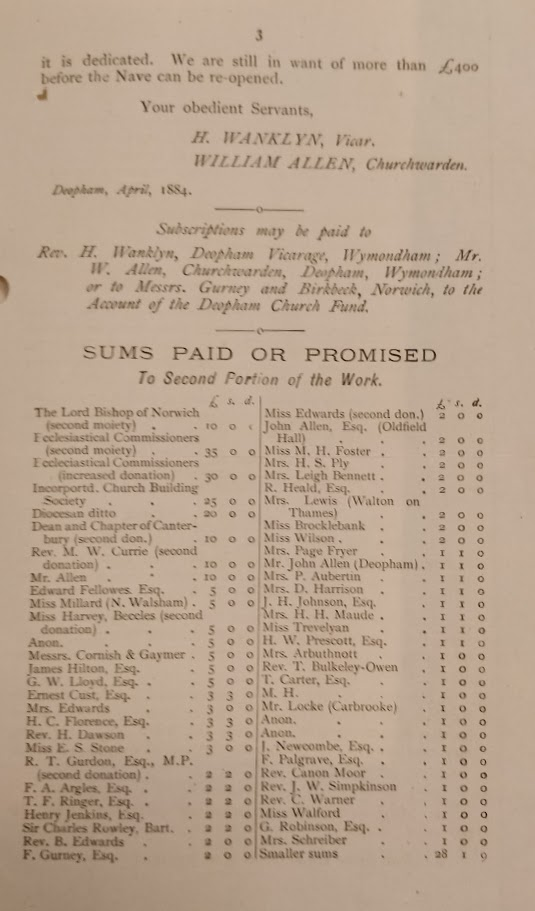 Miss Rowing donated £5 – this would have been Miss Mary Ann Rowing of The Green in Deopham.