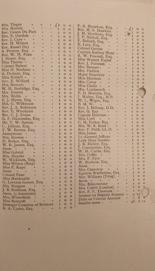 The £25 from the Incorporated Church Building Society is recorded in their annual report as being authorised in 18641 under the sub-heading of “Enlarging or otherwise increasing the accommodation in the Churches”; it is advertised by the plaque on the north wall of the church (where they are referred to as “The Incorporated Society for Building & Churches”).