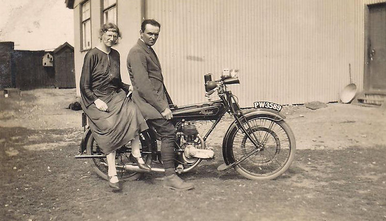 The Retreat was the name given to the Tin School after its closure in 1924. In the picture is Hettie (née Turner) and James (Jimmy) Sturman. The motorbike appears to be a Raleigh Model 6, manufactured c1925, which dates the photo as possibly the late 1920s.