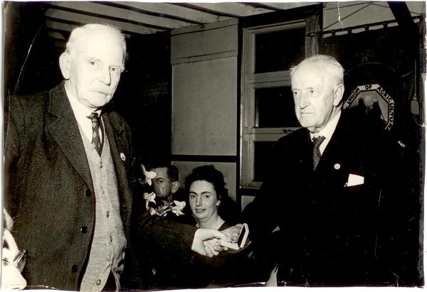 Mr Frederick Leveridge (on left) of Deopham receiving his gold medal (A.W.U.) for 50 years service from Mr Edwin Gooch.