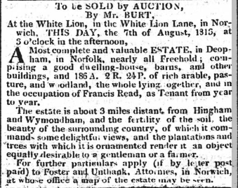 The following advertisement appeared in the Norfolk Chronicle dated August 7th, 1813, listing Francis Read as the tenant: