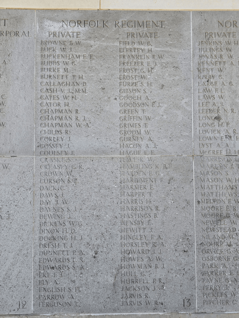 Private 200501 Percy Robert Hurrell was born in Paddington, London in c.1895. He enlisted in the 1st/4th Norfolk Regiment in Norwich. He served on the Balkan front from 6th August 1915 and later in Palestine where he was killed in action at the Battle of Gaza on 19th April 1917, aged 22. He is remembered on the Jerusalem Memorial Panels 12 to 15 and on the Deopham War Memorial. He was the eldest son of Robert and Eleanor Hurrell.